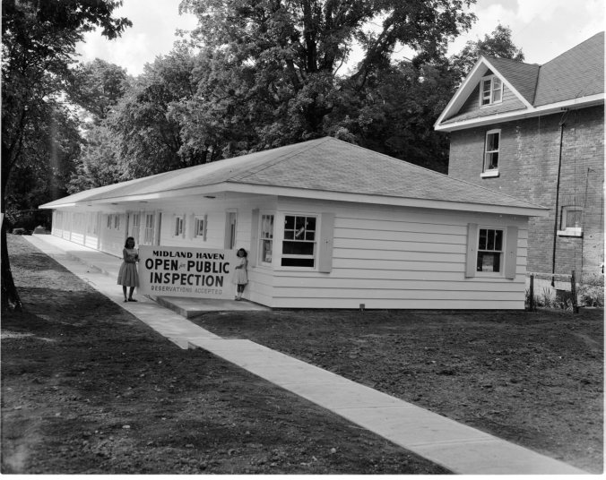 Newest apartment building in this area, Midland Haven (top) was open for public inspection last weekend and is being readied for occupancy Sept. 1. Mrs. Roland Desroches and daughters, Jean, 10, left, and Alice, 13, shows one of the eight modern kitchen units in the new building.