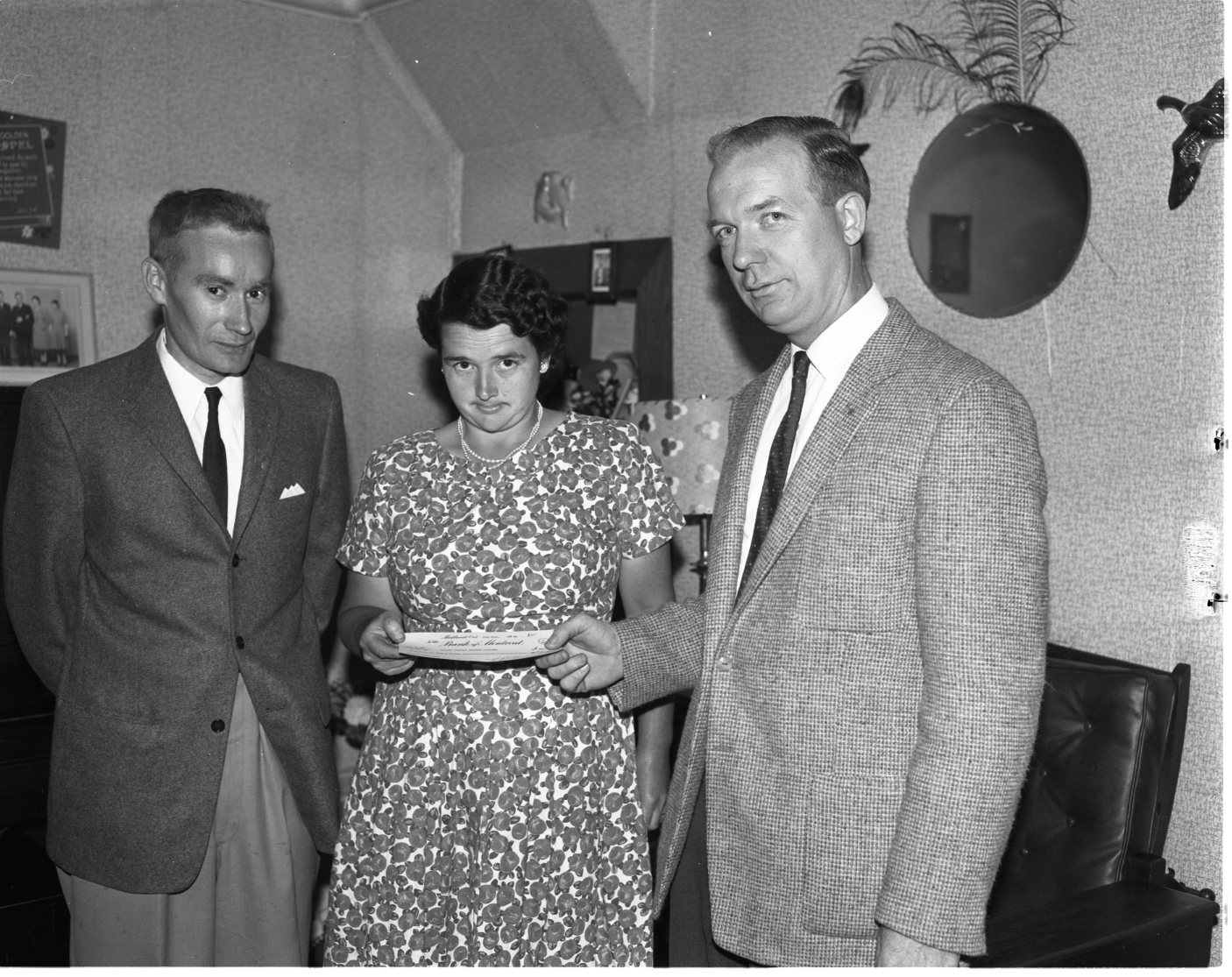 Presentation of a cheque for $200 made by Midland Rotary club last week to help set up new school facilities for retarded children of the area. President of the Huronia Association for Retarded Children, Mrs. Jack Banks with the cheque in her Sixth Street home by Jim Henry, left, Rotary president and Clint Truax, Rotary secretary.