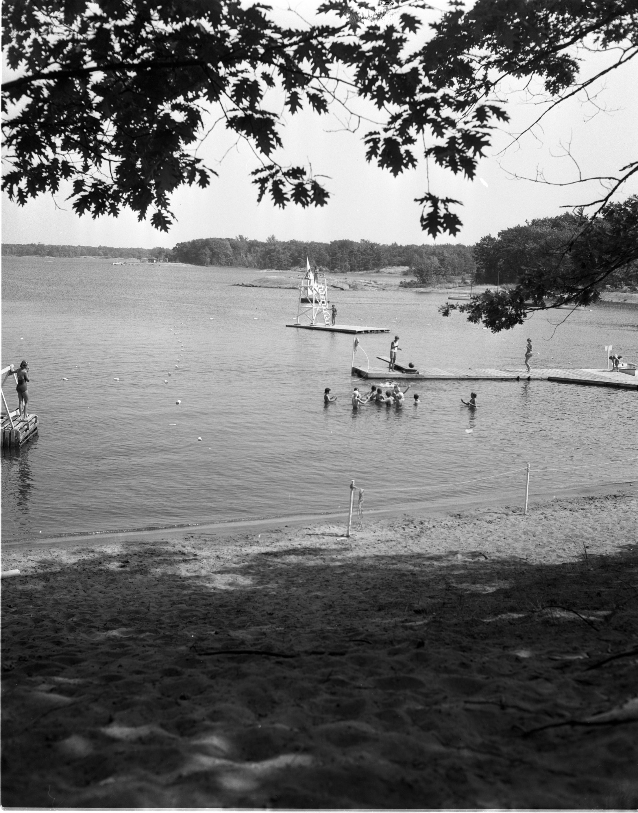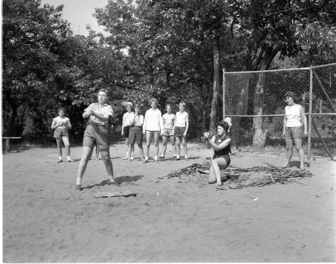 “Yer out” says the umpire, as this young girl takes a healthy cut at the ball and misses during a game at Camp Kitchikewana on Beausoleil Island. Operated by Midland YMCA, the camp has provided healthy recreation for several generations of youngsters from many parts of the province, as well as Midland.