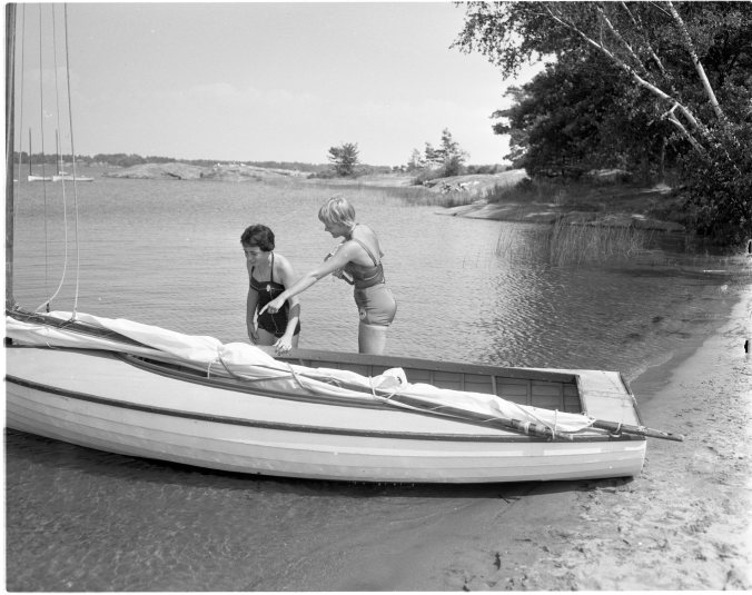 Pretty girls and a sailboat always make a pleasant picture, and there are lots of both Midland YMCA’s Camp Kitchikewana on Beausoleil Island. Here Lorrie Percy of Riverside and Rosemary Kennedy of Owen Sound get ready for a zestful sail on the water of Georgian Bay.