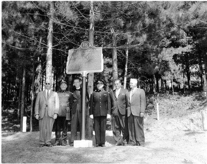 Dignitaries taking part in the unveiling of a plaque in memory of Capt. John Moberly, RN, at Penetang Saturday posed for the above picture following the ceremony. Left to right are W. H. Morrison, Lieut. Col. J. S. Symons, Rev. John Barclay, W/0 1 David Bell, Hon. Bryan Cathcart, minister of travel and publicity, and Dr. Wilfrid Jury.