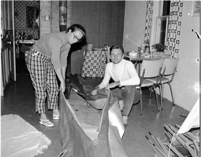 Real adventurers are Mr. and Mrs. Siegfried Schwalbe of Midland, seen above in their William Street home drying out their 15-foot rubberized canvas-covered kayak. The couple and the boat were missing for nearly 24 hours when on a trip to Giant’s Tomb they had been prevented from returning home by high wind and heavy seas. They had been forced to seek shelter on a small island.
