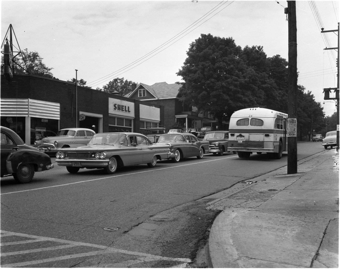 Motorists coming into Midland on Yonge Street during recent weeks will disagree with the Department of Highways officials who maintain there is no need for a stop light at the junction of King and Yonge Streets. Part of a recent tie-up that extended two blocks west on Yonge is seen above.