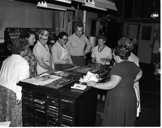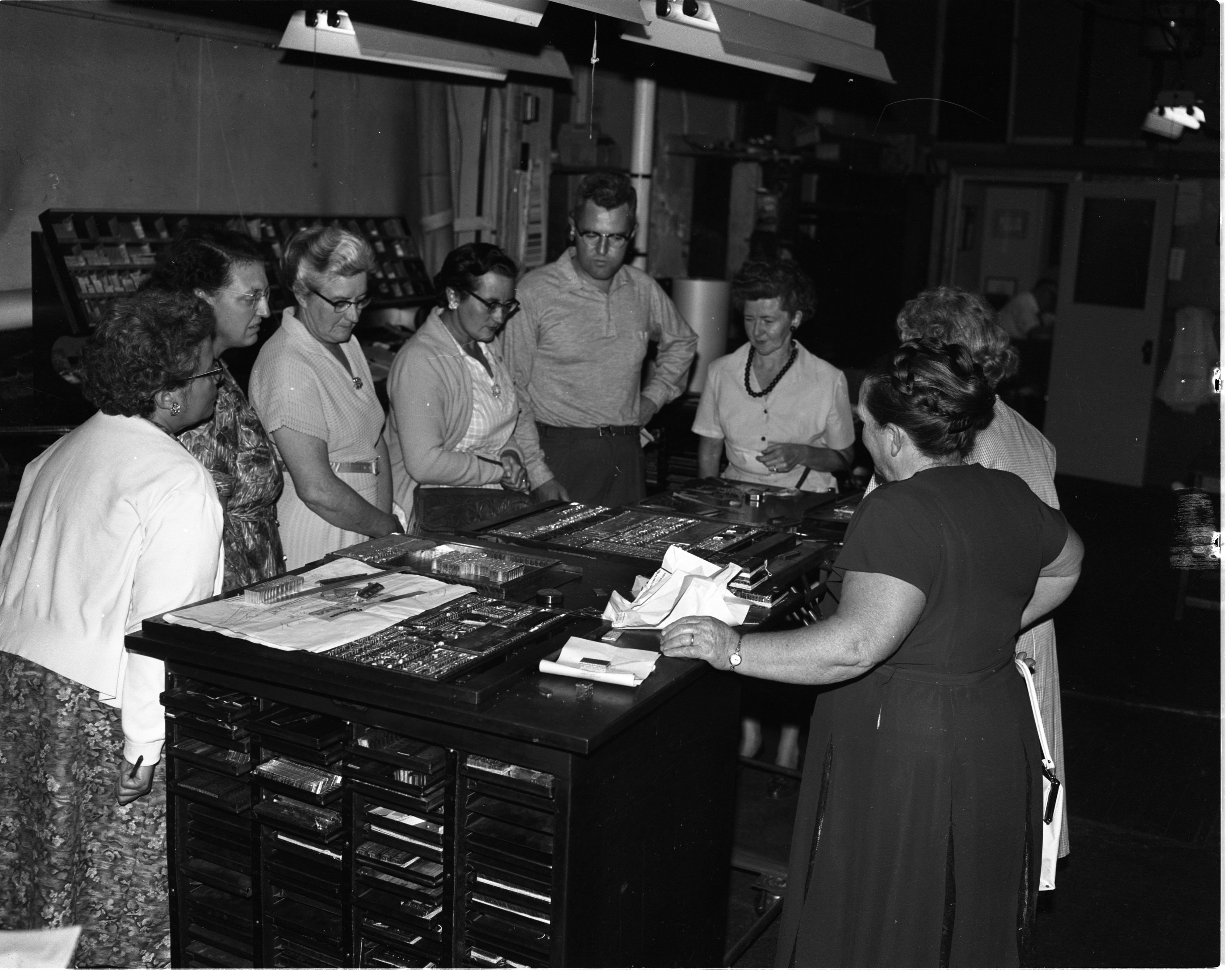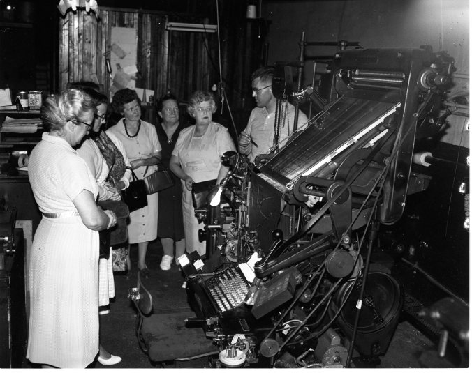 Waverley Women’s Institute visited the Midland Free Press and Midland Printers Limited as part of their regular monthly meeting last Thursday. In these two pictures general manager J. R. Chittick is seen showing members of the group portions of the newspaper plant. Upper photo shows the women getting an explanation of the automatic teletype machine while in the lower the group is seen examining advertising page make-up.