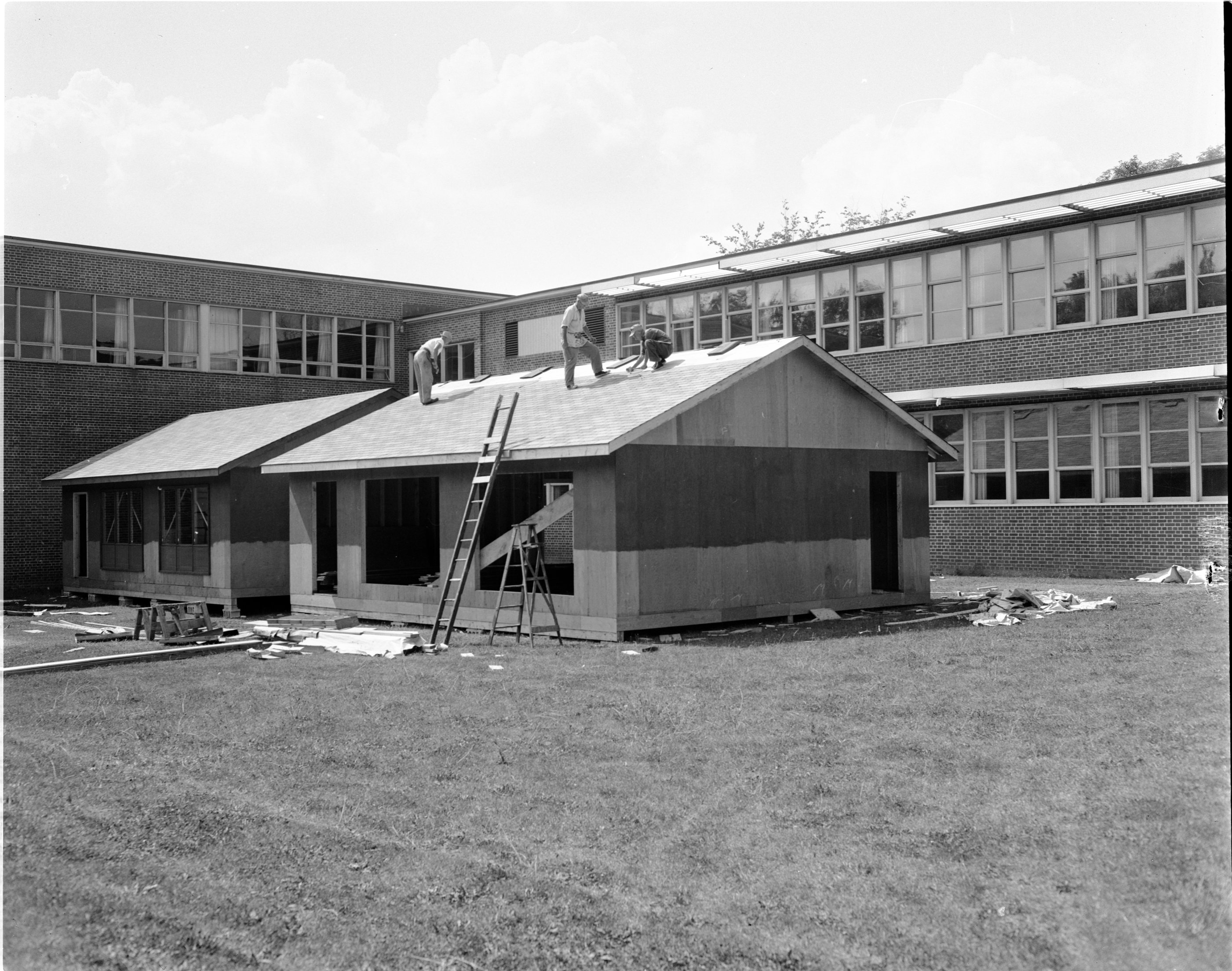 Some seventy pupils at Midland-Penetang District High School will be accommodated in these two temporary classrooms when they return to continue their studies next month. These classrooms behind the main MPDHS building were constructed by James Cowan at a cost of $3,730.