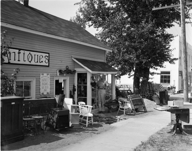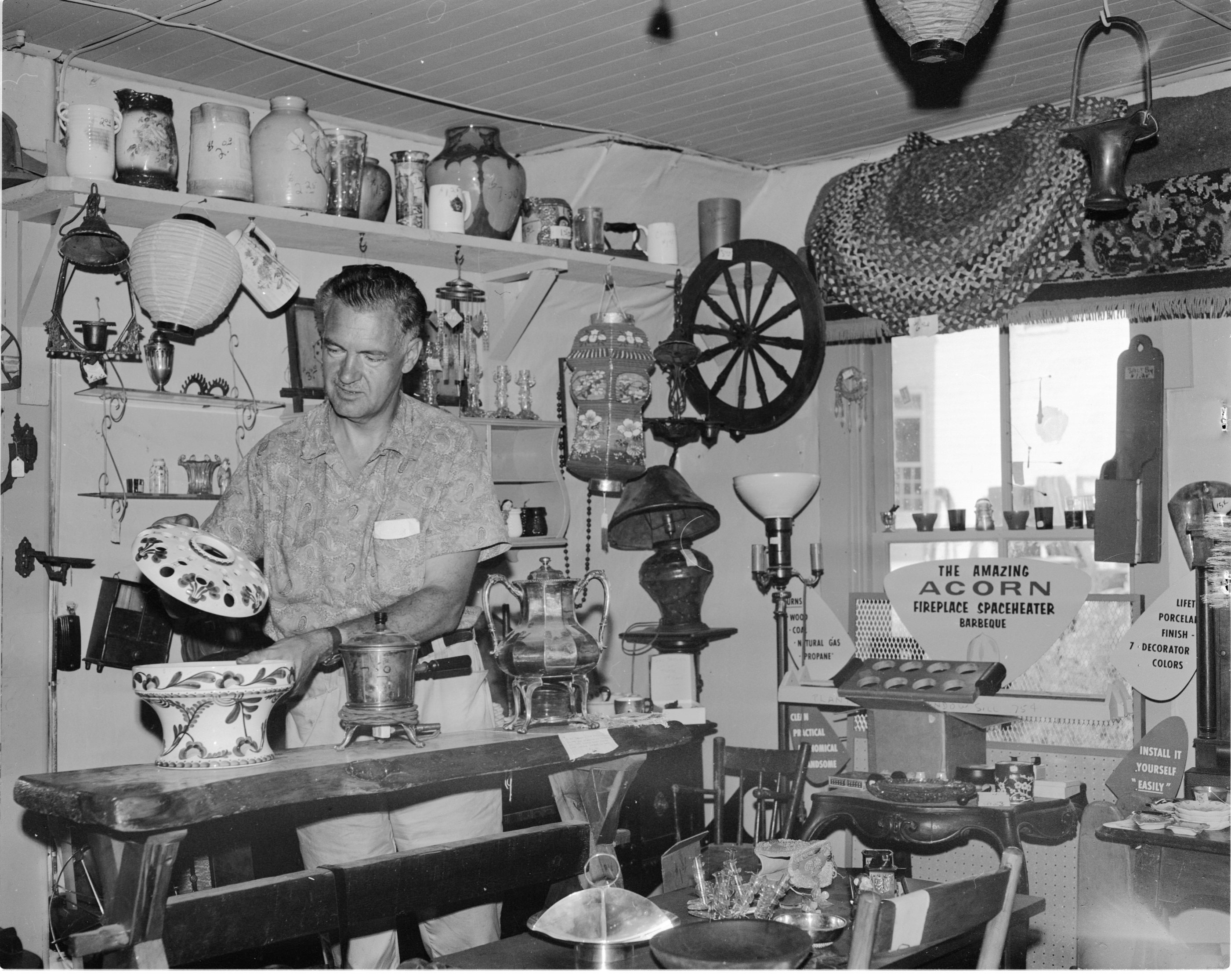 As they like to say in the autobiographies of noted people, Herb Merry of Oakville is a man of many parts. Herb may or may not he “a noted people” yet. But if he isn’t it isn’t because he doesn’t have his finger in enough pies. Among his many titles are deputy-reeve of Oakville, special constable in the OPP on behalf of the OSPCA of which he has been a director for over a decade, the secretary-treasurer of an Oakville radio station and operator of the Owlscroft Cottages at Georgian Shores, near Victoria Harbour. And last, but perhaps not least: he’s the owner and operator of the Paulie Burgie Shop in the Harbour. In case you haven’t happened to notice the Paulie Burgie Shop deals, the sign says quite frankly, in “antiques – bygones – junk”.