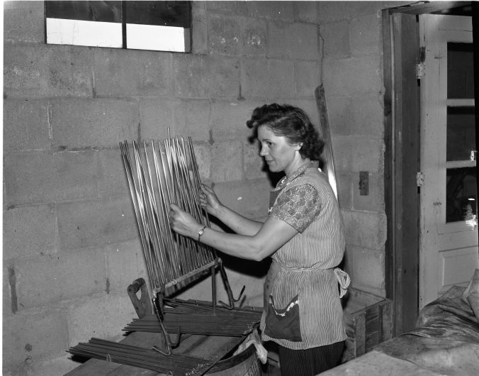 Radio aerials for cars are one of the products turned out by the Dominion Electric-Plating Co. at its new plant on William Street, formerly occupied by Bay Meat Company. Here Mrs. Frank Zgudziak, wife of the proprietor, examines some of the aerials.
