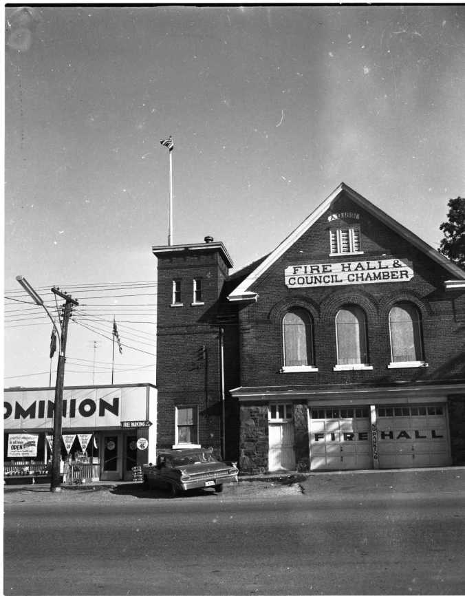 New “Flat Top” look was given to the tower on Penetang’s Town Hall after workmen discovered the belfry was unsafe. Flag can be seen waving from new pole, and the siren has been mounted in the open. Hall is only used now for fire trucks.