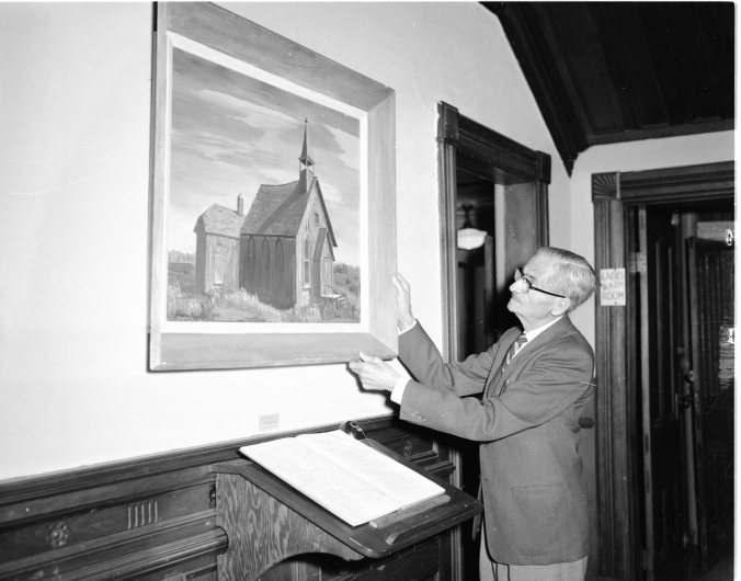 This painting of the old lumberman’s church at Port Severn, by Barrie jeweller Gordon Reeve, is one of a number by district painters assembled by Simcoe County Arts and Crafts Association for display at Midland’s Huronia Museum this year. Assistant curator R. A. Grigg is seen with the painting; which occupies a prominent place in the lower hall. From 1959