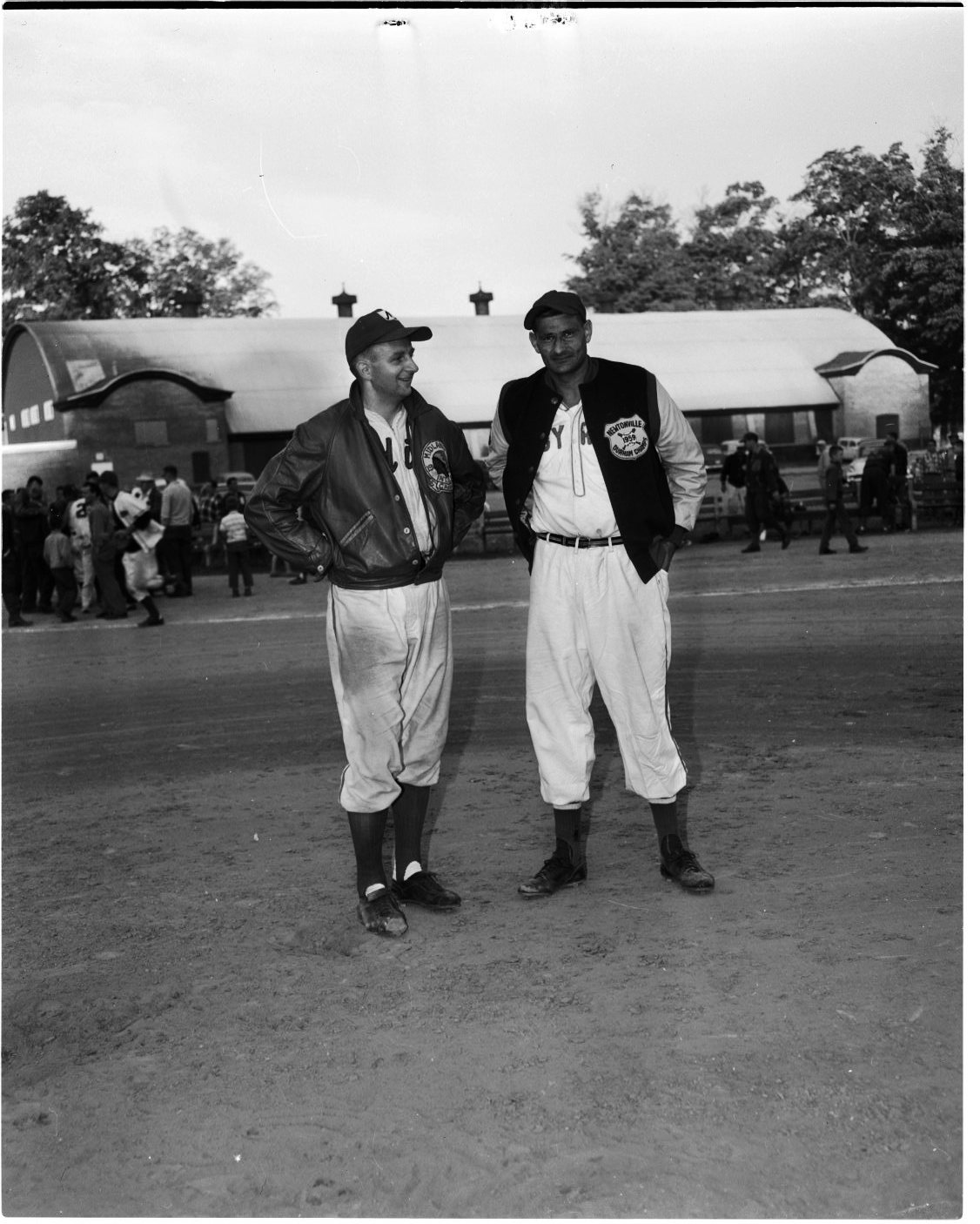 Players on both teams had to look up to this pair who matched pitches in Saturday’s game here. Midland’s Gord Dyment (left) hurled steady ball to gain a 9-5 decision and John Holman gave six innings of fine relief pitching for the losing Port Hope team in the first game of the semi-final series.
