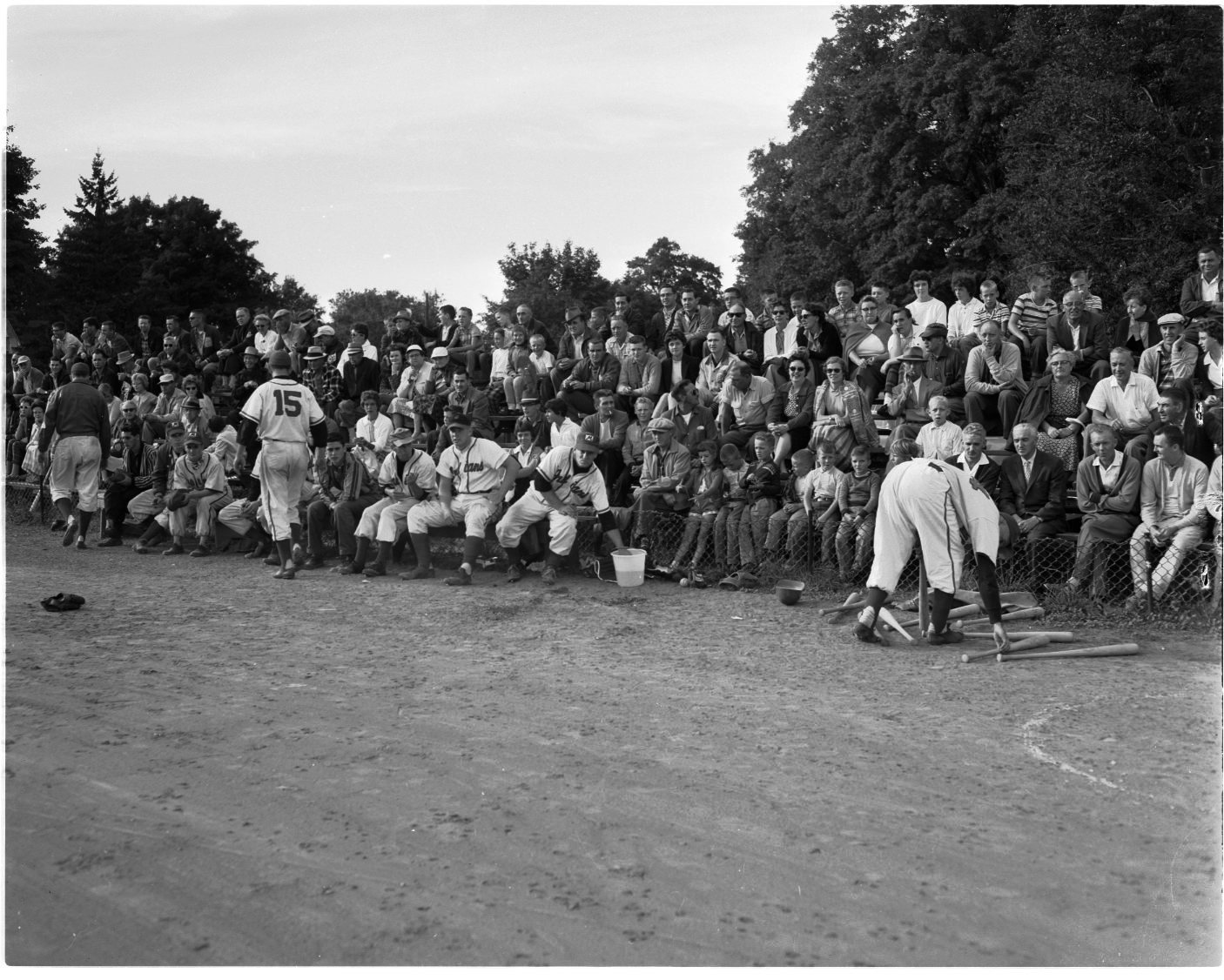 Part of the largest crowd to see a ball game in Midland this season is seen above, as they watched Indians down Port Hope 9-5 Saturday in the first game of the OBA intermediate “A” major semi-finals. The teams meet again in Port Hope today with the third game tentatively slated for Midland next Sunday, providing the grounds can be cleaned up in time following the Tiny-Tay fair.