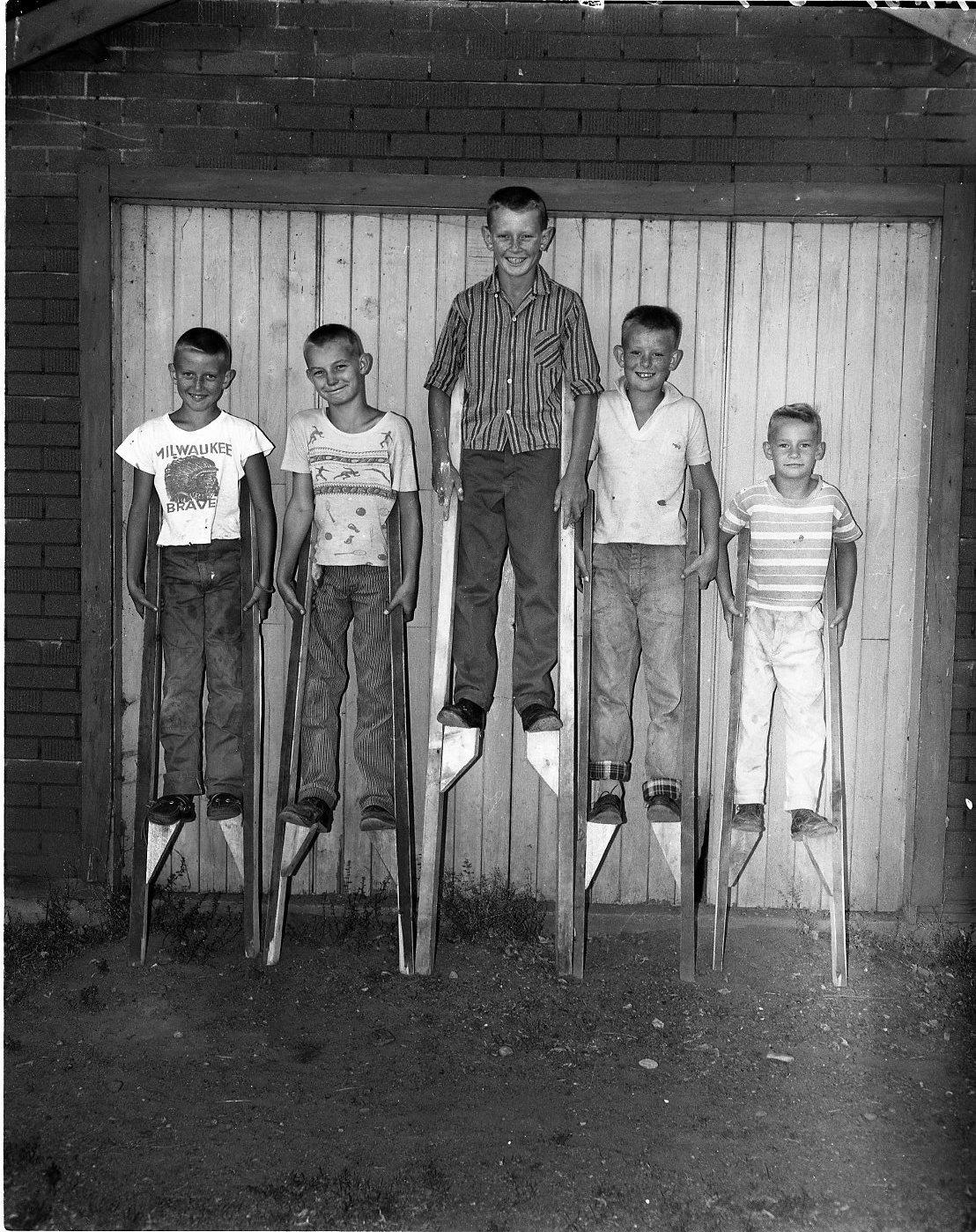 Getting up in the world, temporarily at least, are left to right, Don Hurlbut, Gordon Paul, Chester Graham, Gary White and Andy Puddicombe. When Andy’s father, John Puddicombe, 189 George Street, made a set of stilts for his son, the idea became so popular he had to make five more pairs to keep other lads in the neighborhood happy.