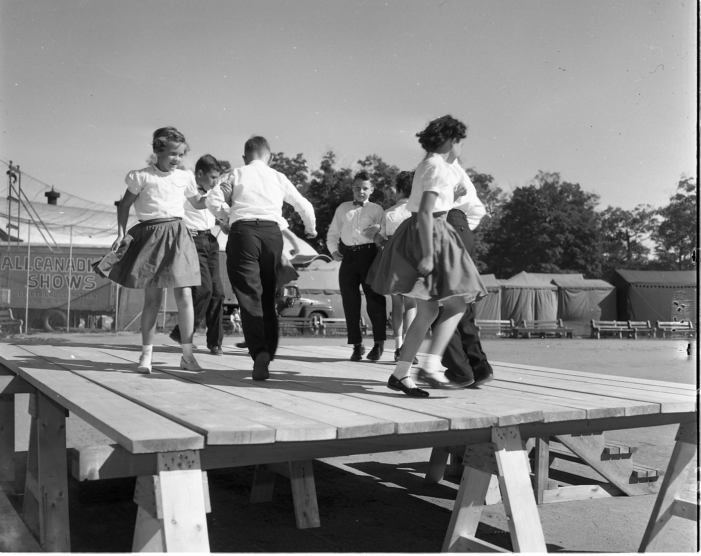 Although rain marred the final day of this year’s Midland fair Saturday, the sun shone brightly for the school children Friday. Here two groups of youngsters have a lot of fun performing square dances. At top are the Vasey “Squarettes”, with an older group from Waverley going through their paces in the lower picture.