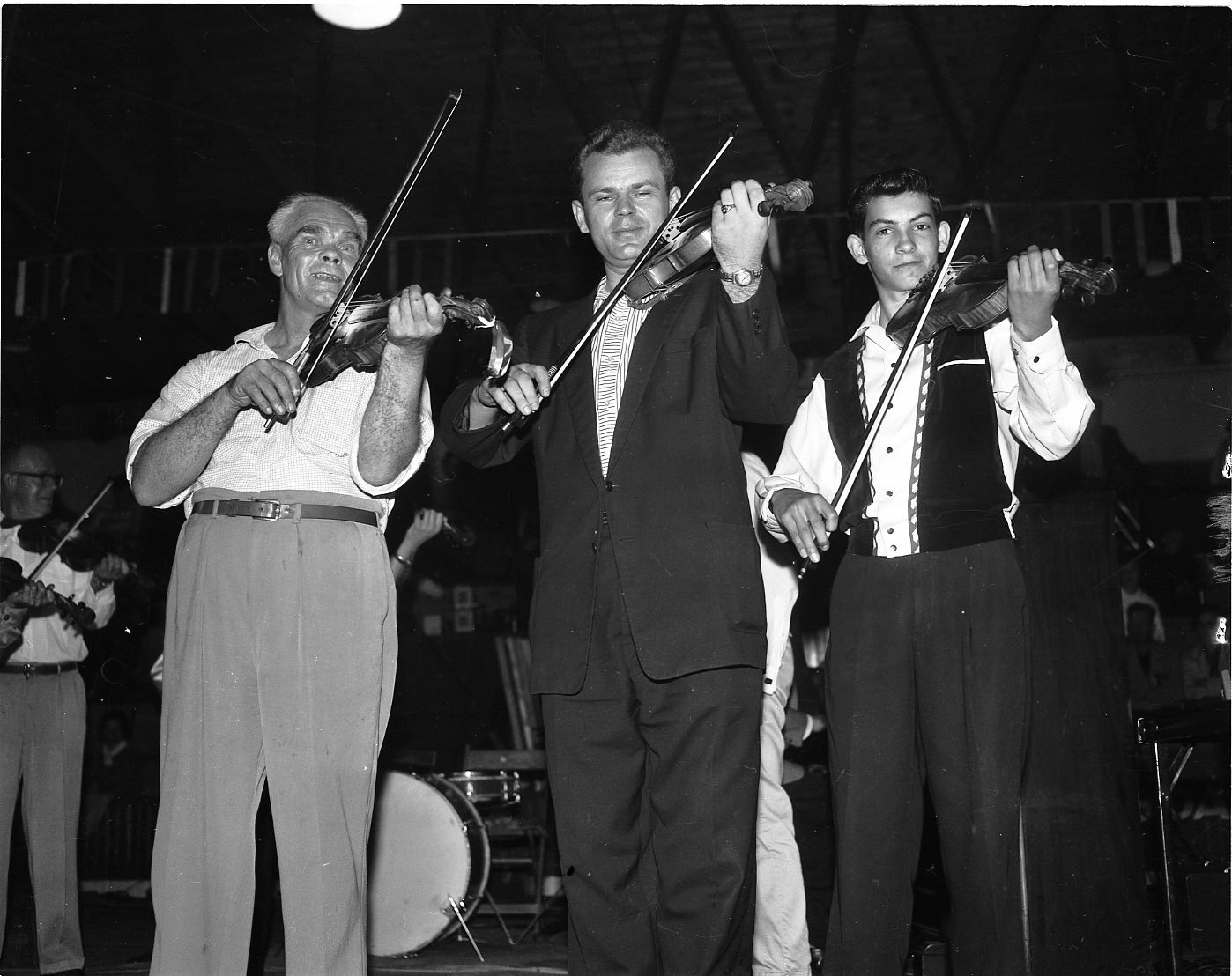 These three chaps fiddled their way to top prize money in the old time fiddlers contest held as part of Tiny and Tay fair in Midland Saturday night. Left to right are Alcime Robitaille of Thunder Bay, who placed second; the winner, Vic Passivisty, 30, of Toronto; and Lloyd Preston, Wyebridge youngster who finished third.