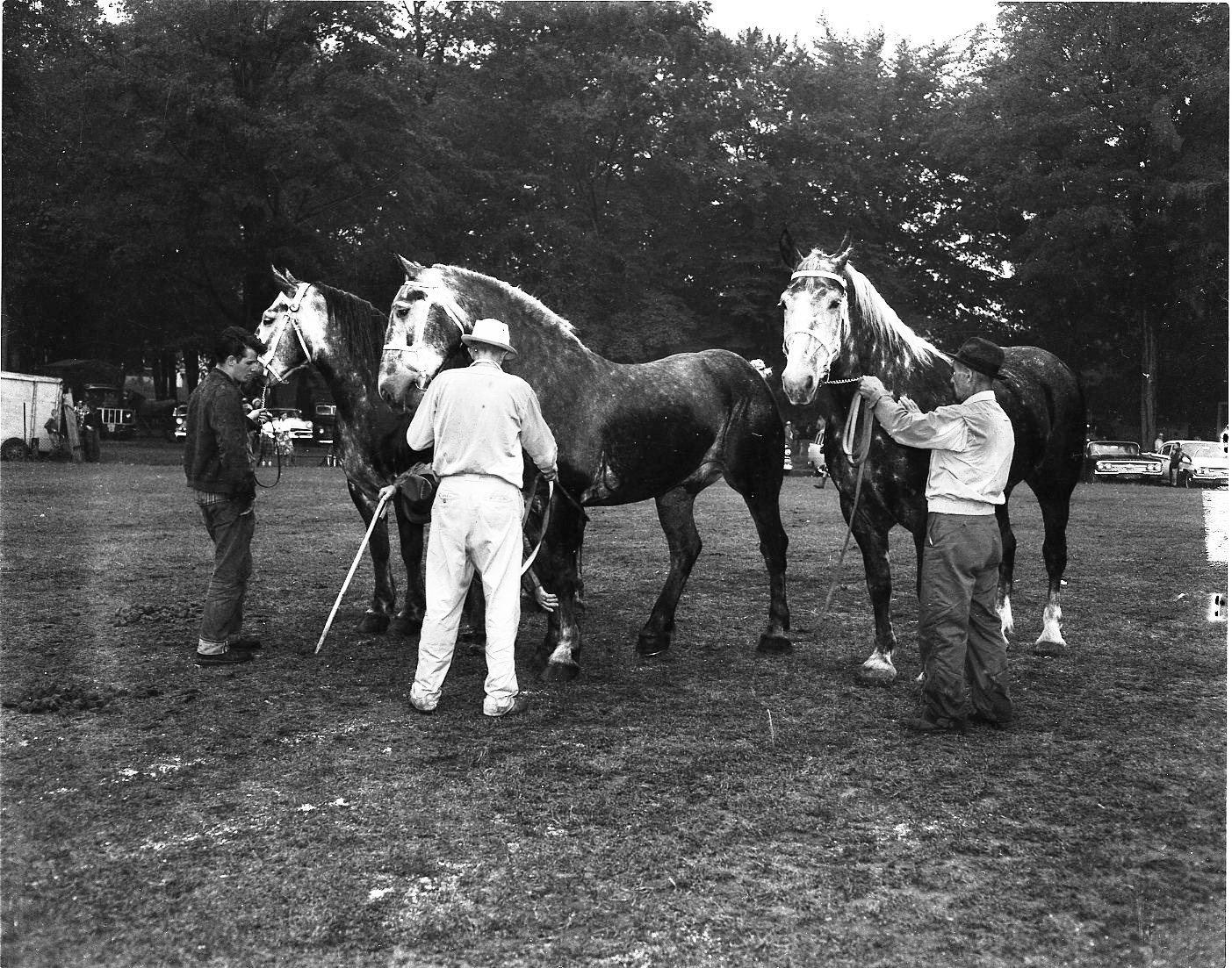 While the quality remained high, the number of animals which took part in the heavy horse show at Midland was somewhat below that of recent years, officials said. Three Percherons are being judged in the picture above, under adverse conditions which continued all afternoon.
