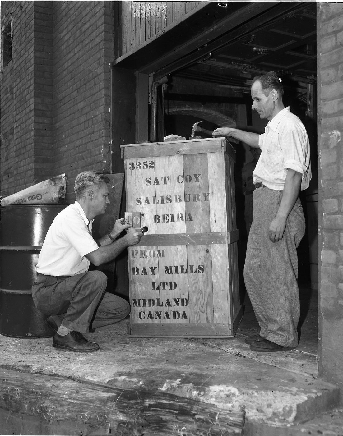 This cask, containing 25,000 square feet of fibreglass screening, “Permascreen”, made by Bay Mills Ltd. of Midland, will shortly start a long journey to Salisbury, Southern Rhodesia, in Africa. The Beira on the case is the port in Portugueses East Africa where it will leave the ship. The shipment is the second of the export variety made by Bay Mills in recent months.