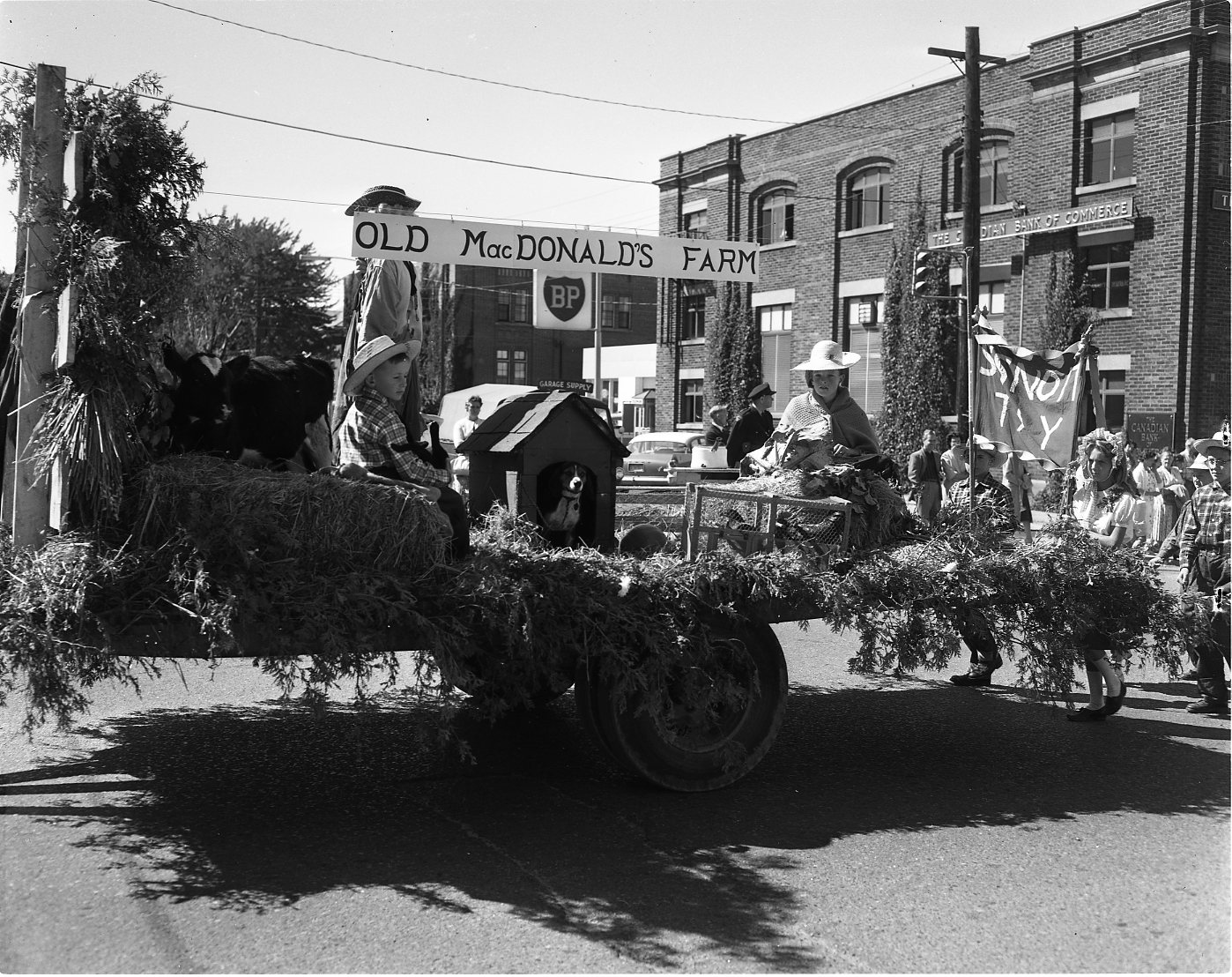 Many of the schools entered in the parade held as part or children’s day at Midland fall fair this year also came provided with fine floats, as well as eager young marchers. “Old MacDonald’s Farm” provided a well-portrayed theme for one Tay Township school.