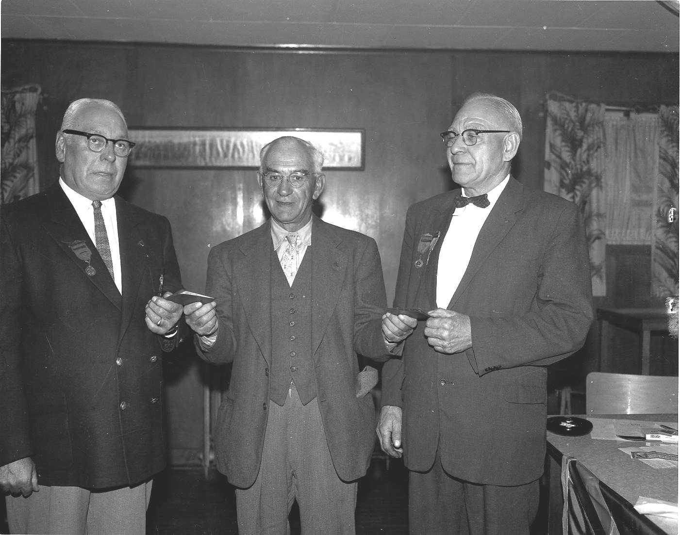 Members of Branch 80, Canadian Legion, Midland, honoured two veteran members Wednesday night when Len Wiles, left, and Herb Wiles were presented with life memberships in the Legion. Another veteran Legionnaire, Harry May, center, presented the memberships on behalf of the branch.