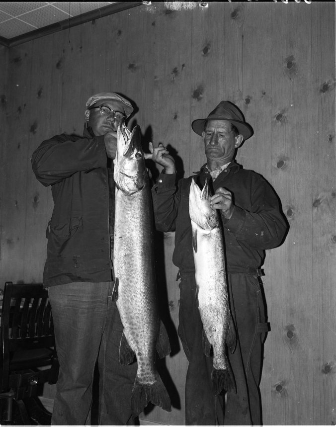 Bill Johnson of 12 Victoria Street, Midland, left, holds the 22-pound, 46-inch muskellunge he caught off Methodist Island Tuesday morning. His fishing companion, Bill Hebner of 115 Gloucester Street, holds an eight-pound, 30-inch pike he caught the same day. They were fishing with Guy Hebner.