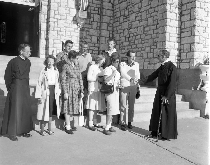 Finish of the fourth annual students cross pilgrimage from Toronto to Martyrs’ Shrine was completed last week by five of the 15 persons who started the 94-mile jaunt. Four more who joined in for the last 32 miles from Barrie are seen in the group above, being greeted at the Shrine by Rev. Dennis A. Hegarty. Included in the group was a young student from the University of Paris.