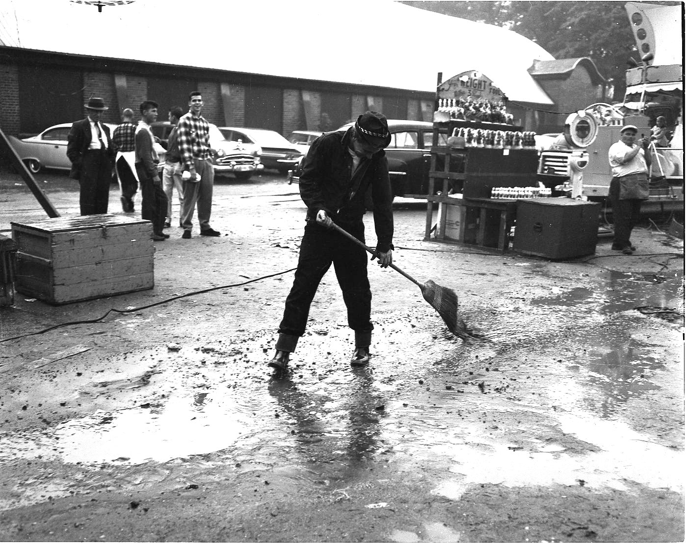 Torrential rains Saturday afternoon and evening did their best to make things tough for everybody concerned at Midland fair. Here a Midway worker directs one of the many streams of water into the only catch basin handy.