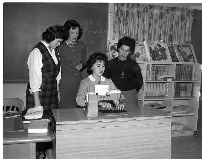 These women are among 40 taking basic sewing in the new night classes being sponsored by Midland-Penetang District High School. Miss Anne Hermann (Mrs. Charlie Scott) (seated) is explaining the intricacies of the sewing machine to, left to right, Miss Joyce Gregoire, Mrs. Joyce Smith and Mrs. John Maxwell.