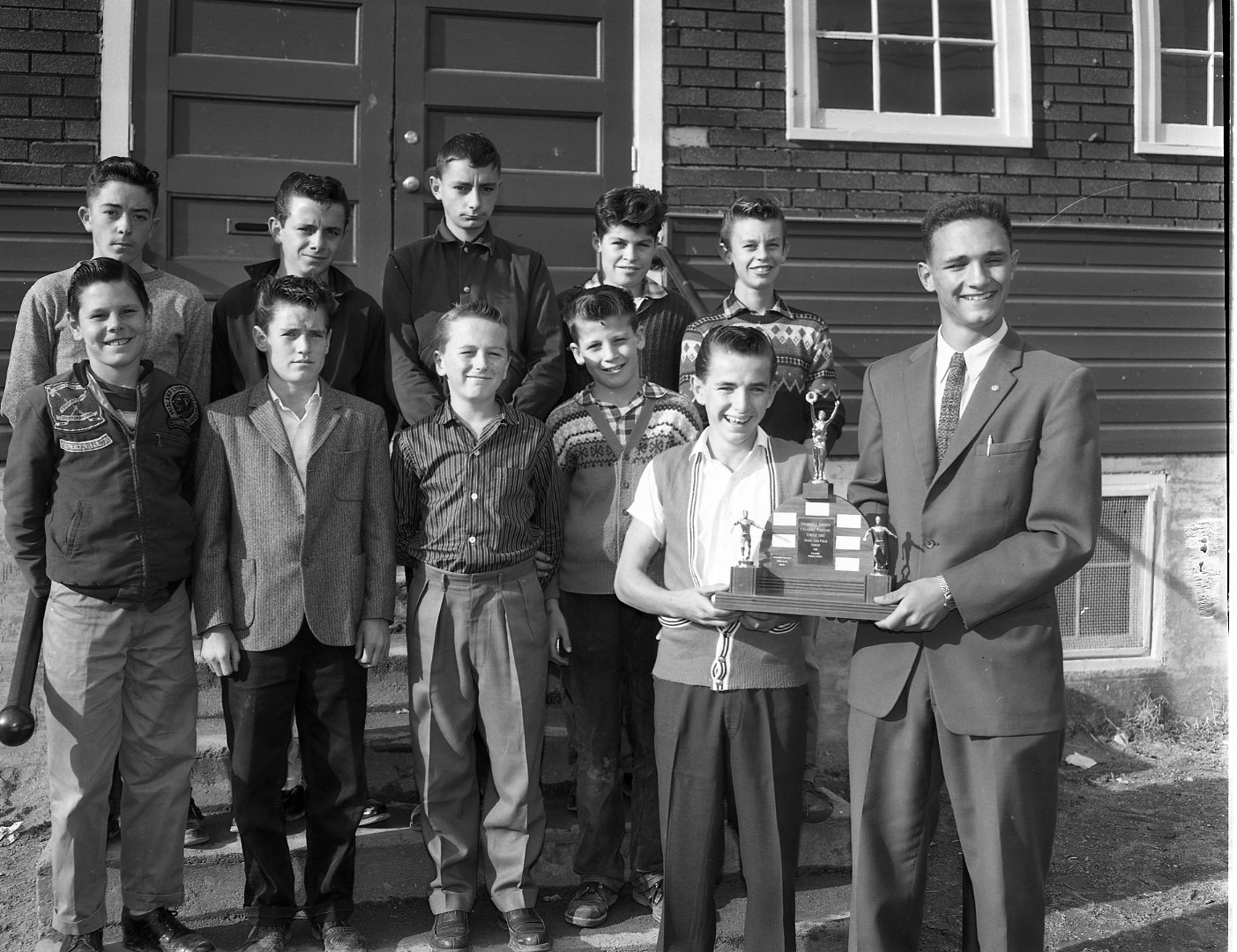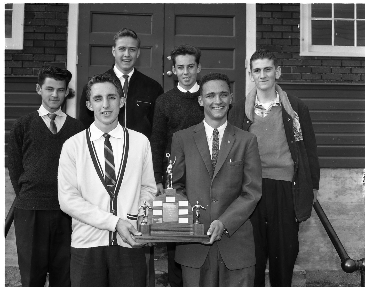 One of the newest youth organizations in Midland is the Columbian Squires of St. Theresa’s High School. Some of the members are seen above with the trophy they presented for competition among four elementary schools in Midland and Penetang. Left to right are, front row, Bob McLaughlin and Paul Tremblay, Chief Squire; back row — Michael Moreau, Ronald Belanger, Gary Blake, and John Charlebois.