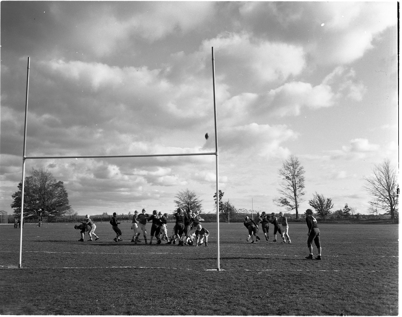 MPDHS senior “gridders” missed a chance to add to their scoring record for the year as this convert attempt sailed wide of the post last week. They didn’t need the single point too much. Final score was MPDHS 66 Barrie Central 0.