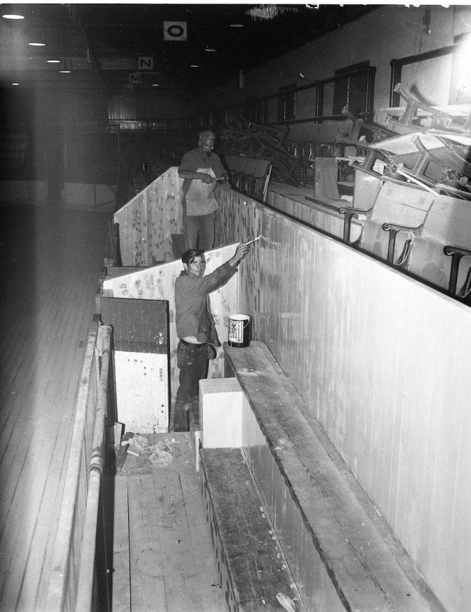 New players’ boxes are among the renovations being carried out at Midland’s Arena Gardens in preparation for another season. Here workmen are putting the finishing touches on the boxes, which will give the players a chance to sit down for a change.