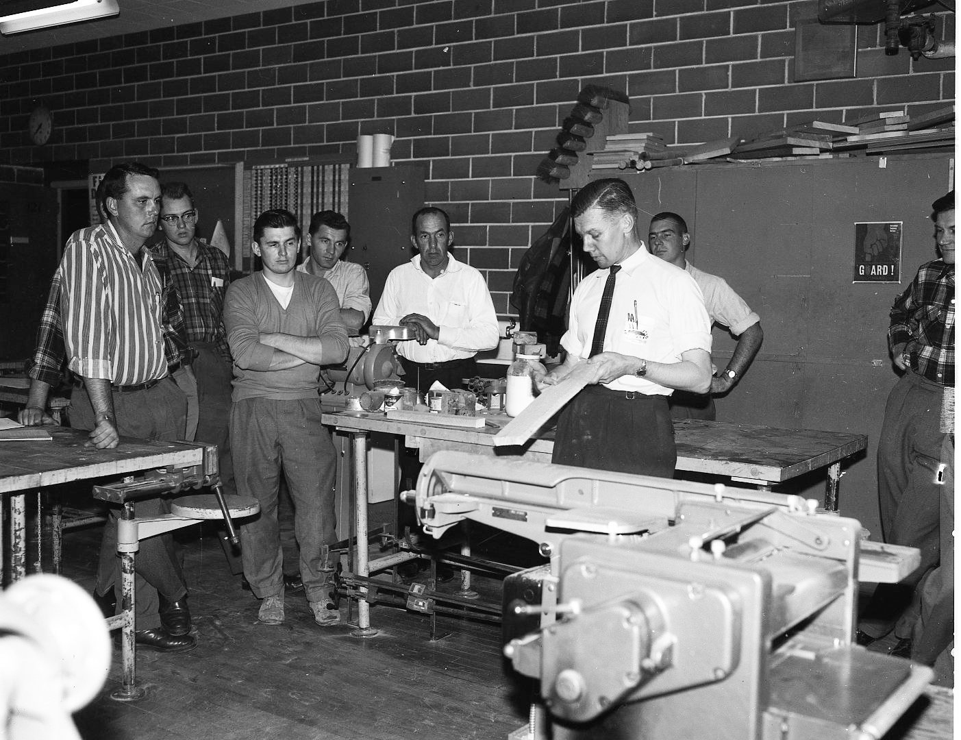 These men should be real handy around the house after they finish a term at MPDHS’ night school in wood working, which got underway this week. W. E. “Bill” Hanna, the instructor, is giving one group some pointers on the use of the jointer machine.