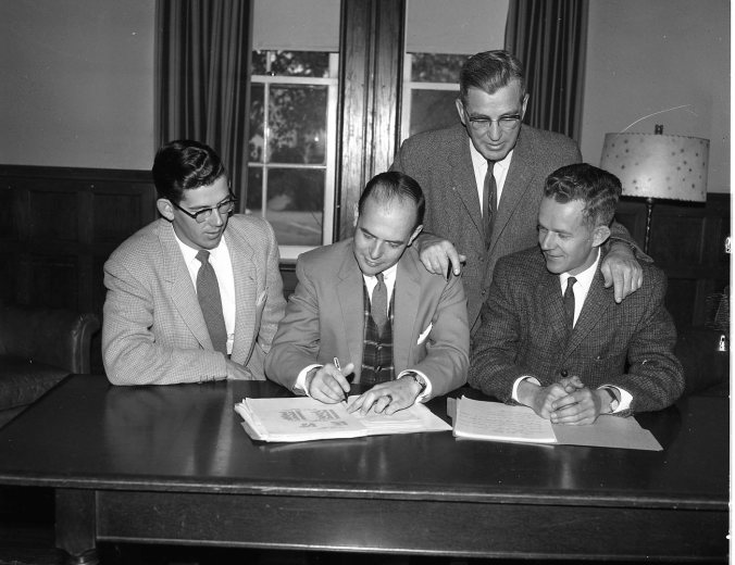 Another YMCA campaign for funds gets underway Nov. 14, with an objective this year of $13,000. Laying plans are, left to right, Keith Smith, ‘Y’ general secretary, J. W. Smith, executive secretary, J. E. Lawlor, campaign chairman and Frank Hartman, publicity chairman.