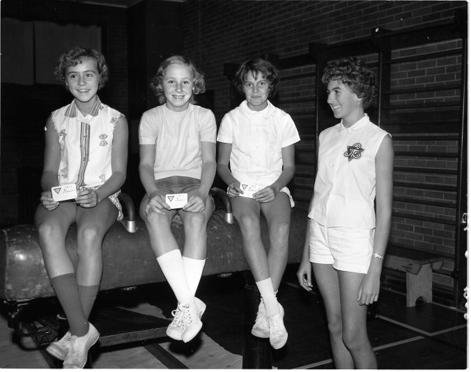 Looking after the physical welfare of the young folk of the community is still one of the main projects of Midland YMCA which opens a $13,000 campaign for funds Nov. 14. These girls recently obtained their first service stars for work on the side horse. Left to right are; Patsy Jeffery, Barbara Spence, Sharon James and Wynne Gilmore, instructress.