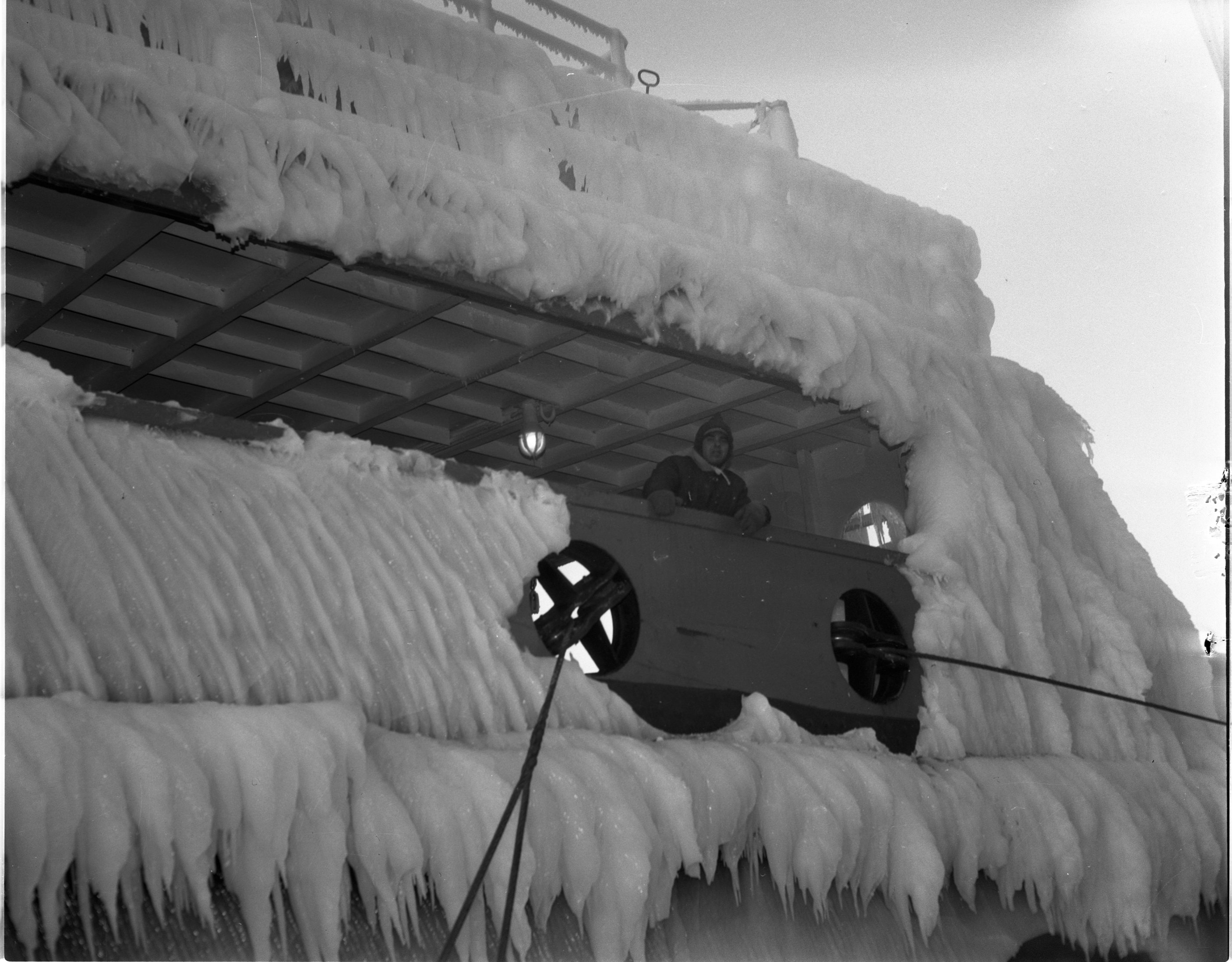 ’Twas an icy world Gilles Ferron looked out of as the freighter Golden Hind docked at Port McNicoll Monday to lay up for the winter season. Sub-zero temperatures and strong winds coated the ship with many tons of ice as she fought her way down the lakes from Port Arthur with her last cargo of the season.