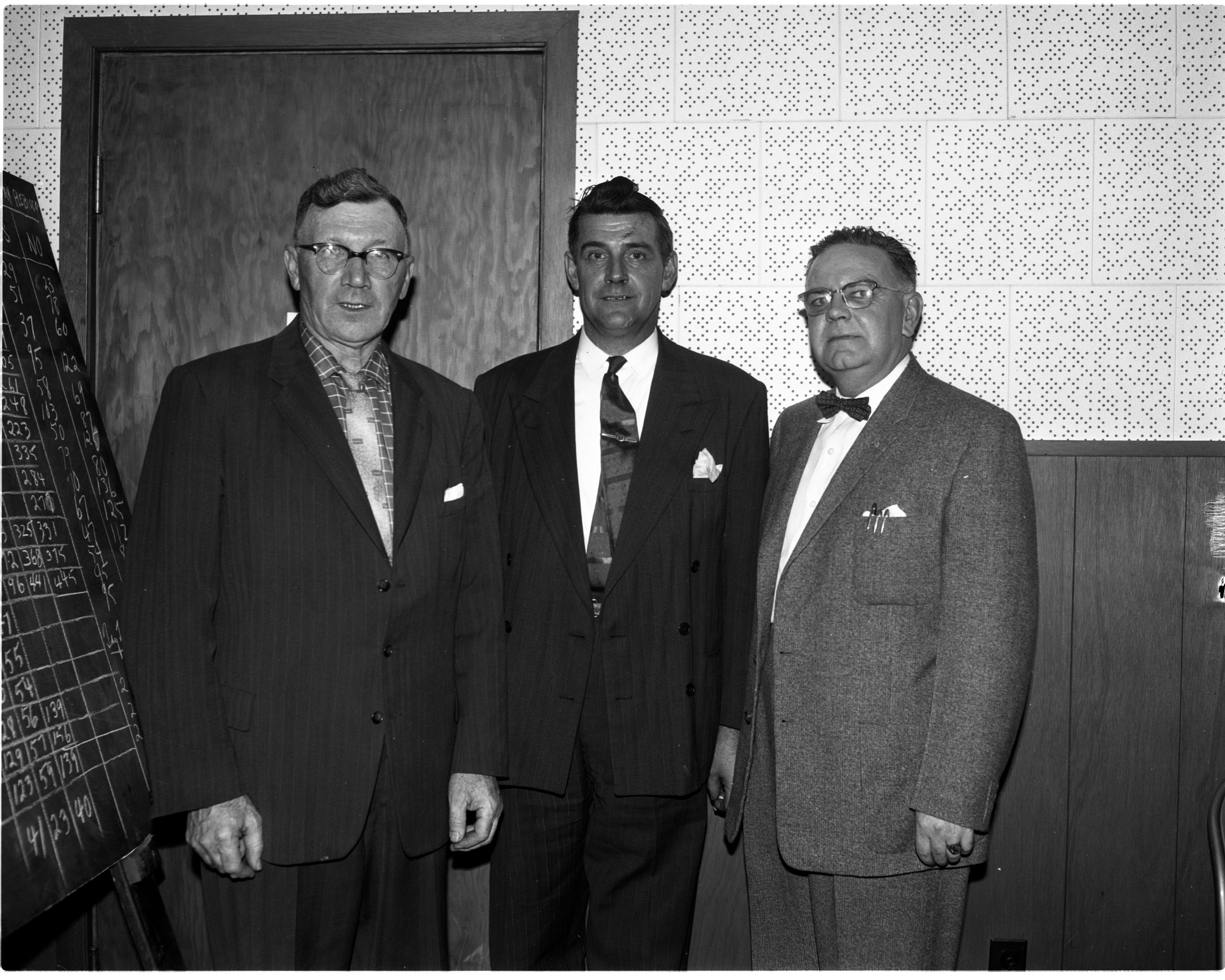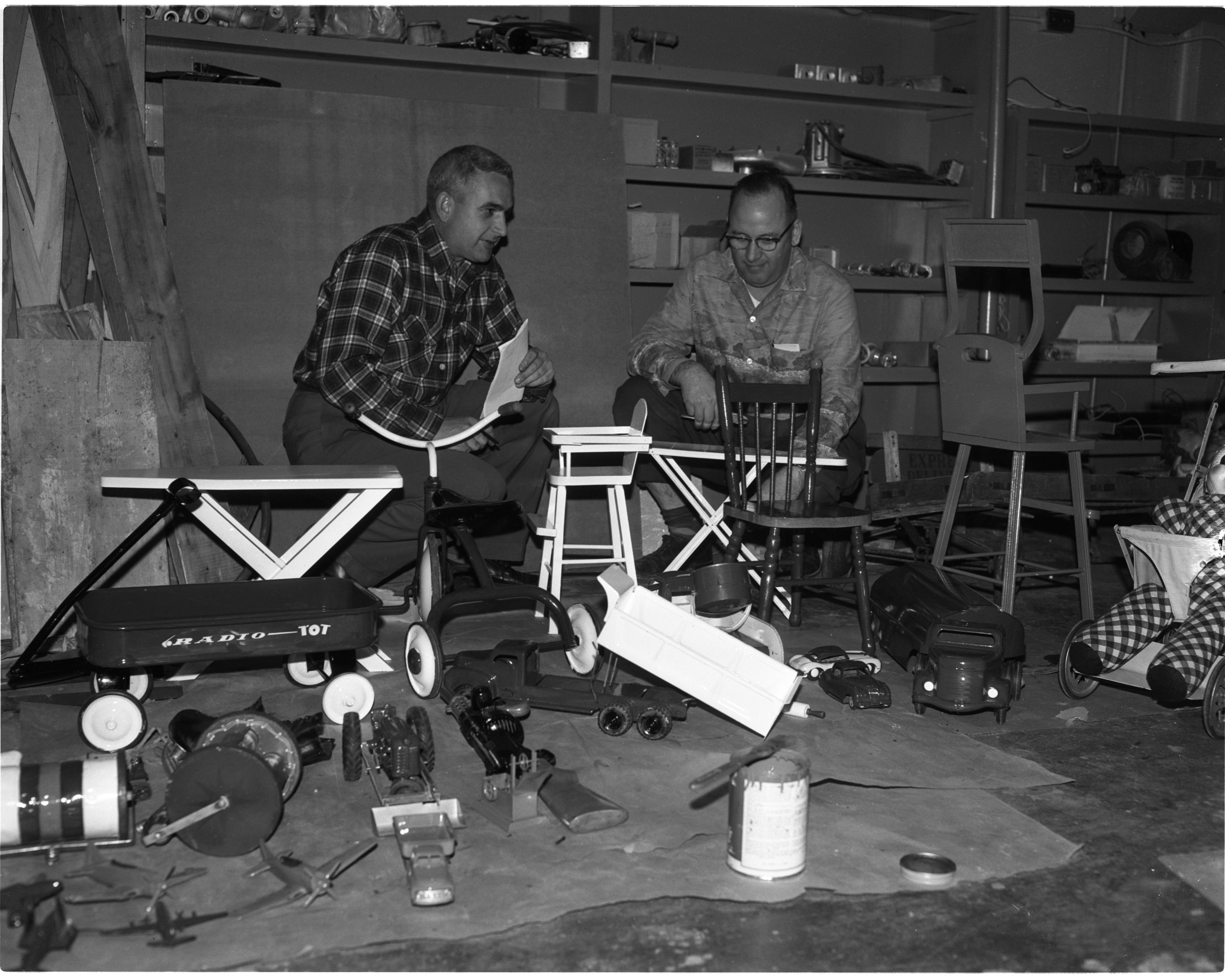 These toys being checked off by Cecil Launder, left, and Ray Church look like they’ve just come off the store shelves. Actually it took many hours of work by volunteers from Pillsbury’s Midland staff to get them back in good condition for distribution to needy children at Christmas time. More toys are still needed, any person who wants to rid his attic or basement of wagons, dolls, carriages or other playthings discarded by his own children is asked to call the Pillsbury office.