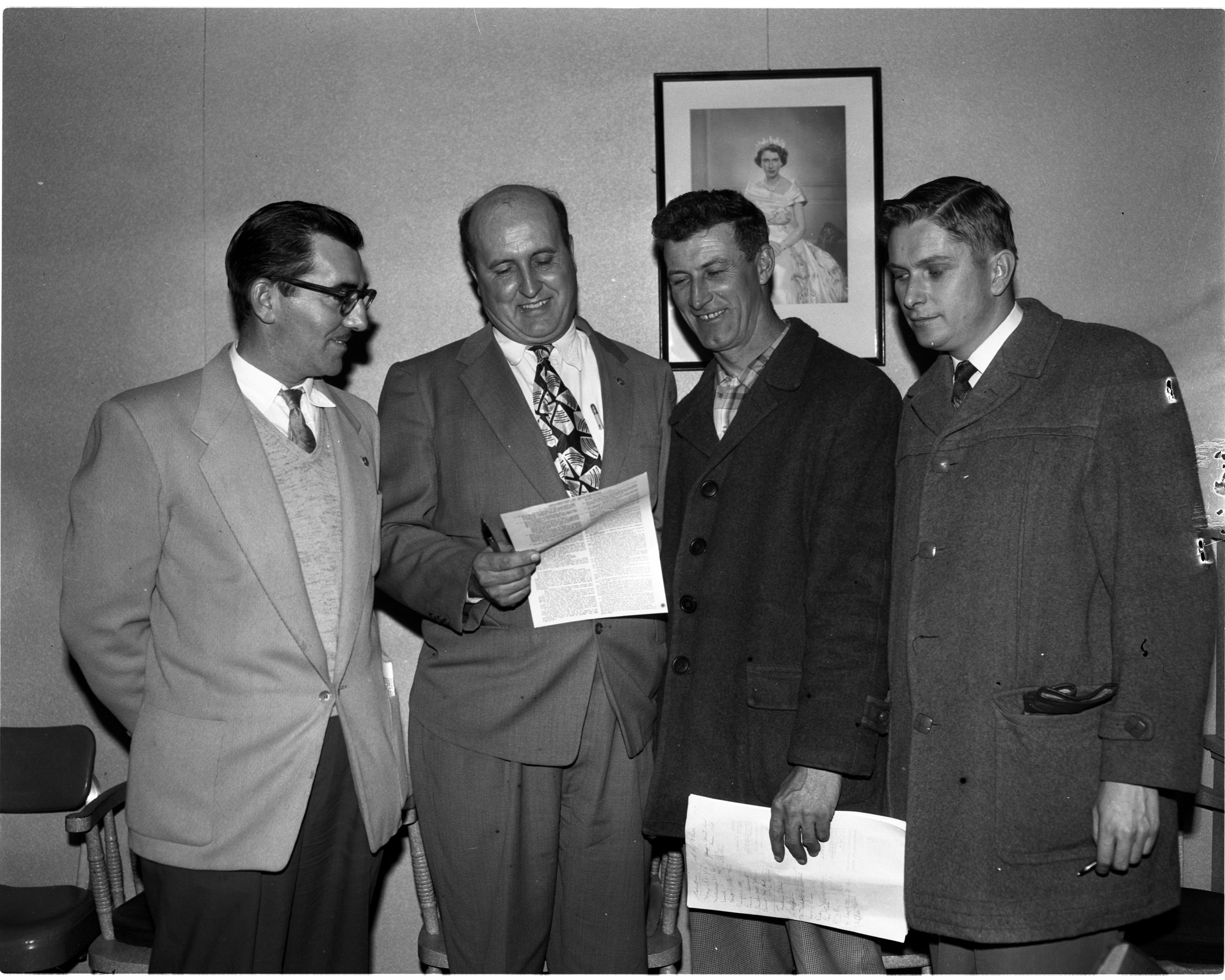 Four more successful candidates in Monday’s municipal election in Midland watch Free Press Herald Manager Bob Chittick totalling the counts on an adding machine. Left to right are Tim Nesbitt, returned to the school board, Albert Atkinson, new alderman for Ward 1, Herb Carpenter, who gained a seat on the PUC, and Frank Bray, several times chairman of the schools board who was re-elected.