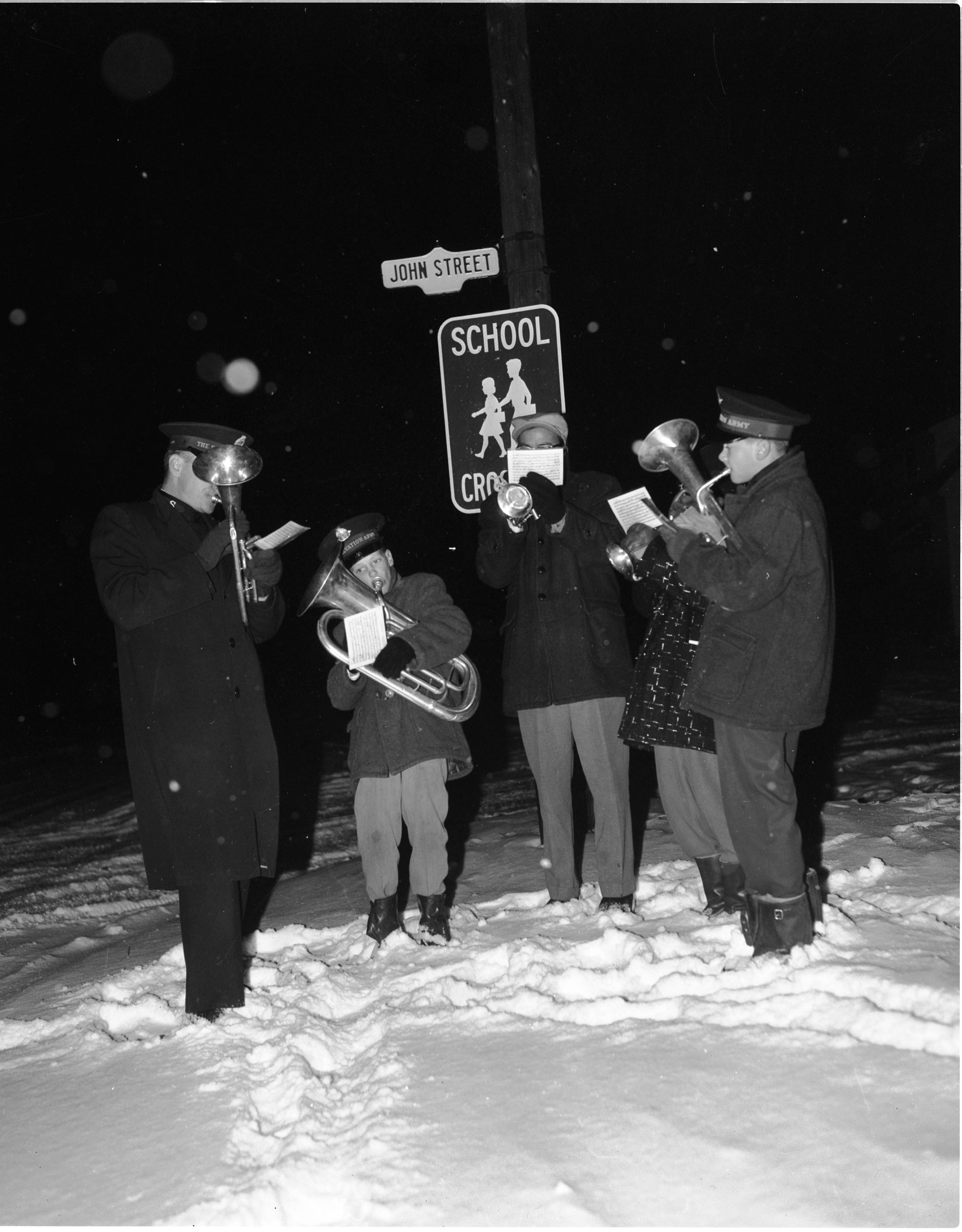 Members of the Midland Salvation Army Corps are raising funds for their Christmas Cheer campaign for the needy by playing carols at various points on Midland streets. Here, except for the modern school crossing and street signs in the background, a quintet of Salvationists present a picture that is symbolic of old-time Christmas card scenes.