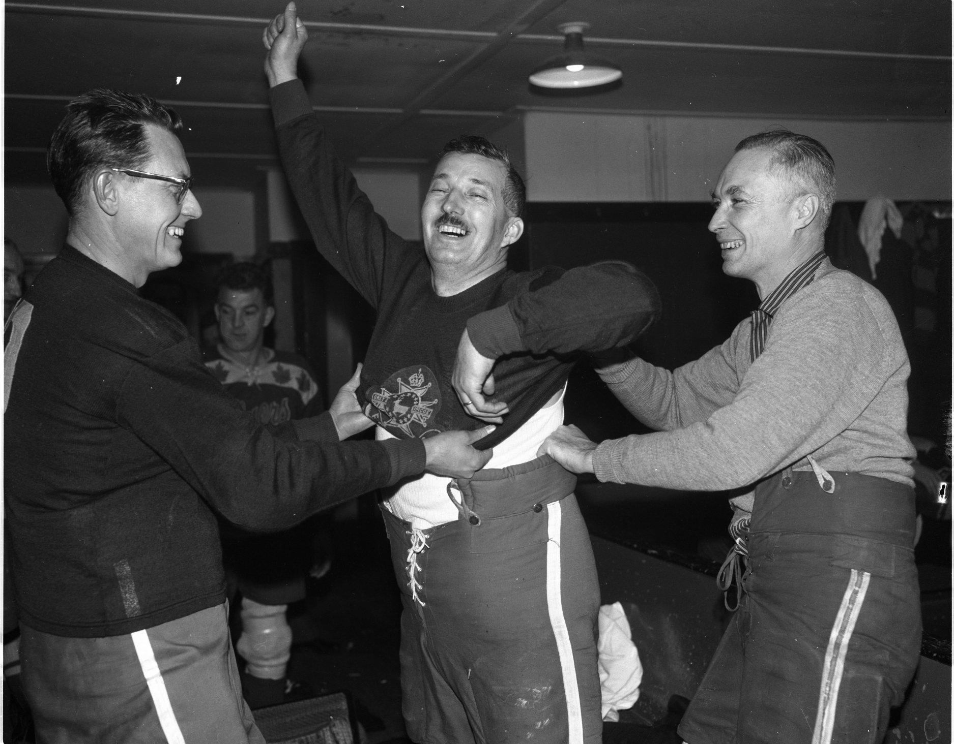 There were plenty of aches afterwards, but everybody was in gay mood before Monday night’s hockey game between the Barrie Radio-TV team and Midland “Selects,” which netted $300 for Midland’s Little NHL. In this picture, Bob Stanway, left, and Rev. Lloyd Delaney “help” Rev. Len Self struggle into his sweater.