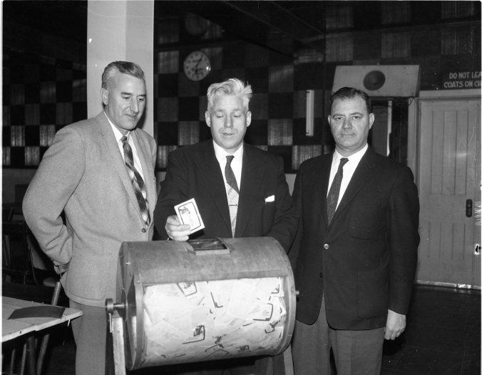 Thousands of tickets were churned up in this drum before Mayor Charles Parker of Midland reached in and selected the winner of the Home of the Week contest. Looking on are Free Press Herald editor Wils Harrison and Advertising Manager Harry Brown.