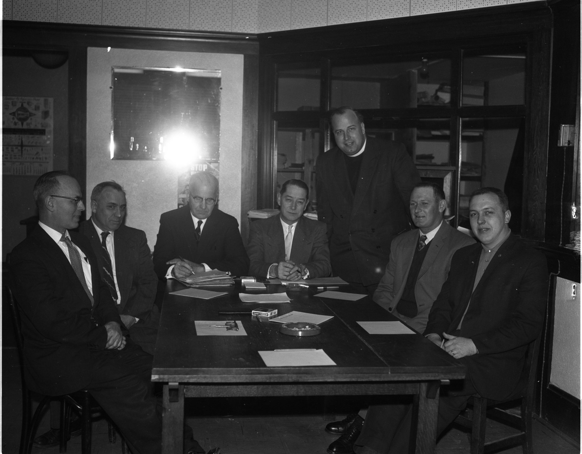 Members of Victoria Harbour’s council for 1961 are seen above during their inaugural meeting Monday night, following a devotional period conducted by Rev, Charles Carter (standing). Seated, left to right are Councillors Oliver and Wilfred Savage, Clerk James Heels, Reeve Ernest Cadeau, and Councillors Albert Cameron and Don Eplett. Mr. Cameron is the only new member of this year’s council.