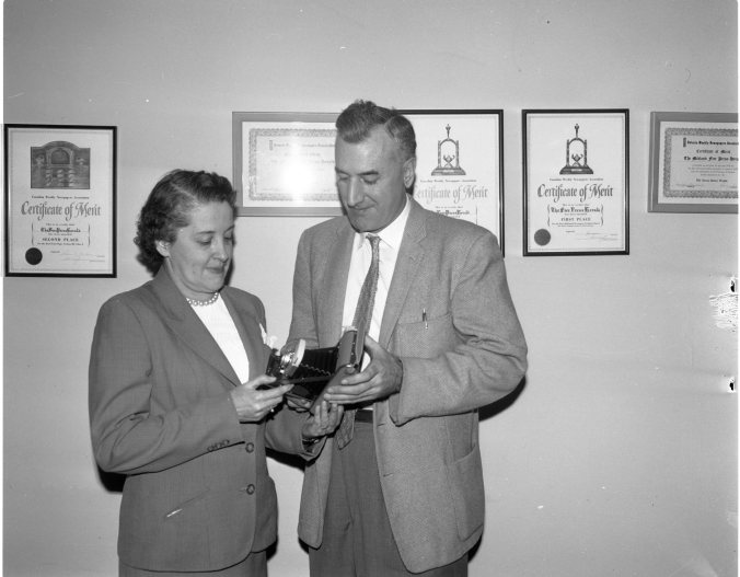 Winner of the first of 12 Polaroid cameras to be awarded in the contest was Mrs. Jean Elsom of 324 Bay Street W., Midland. Here Mrs. Elsom who also won a $5 merchandise certificate earlier in the contest, receives her prize from Editor Wils Harrison.