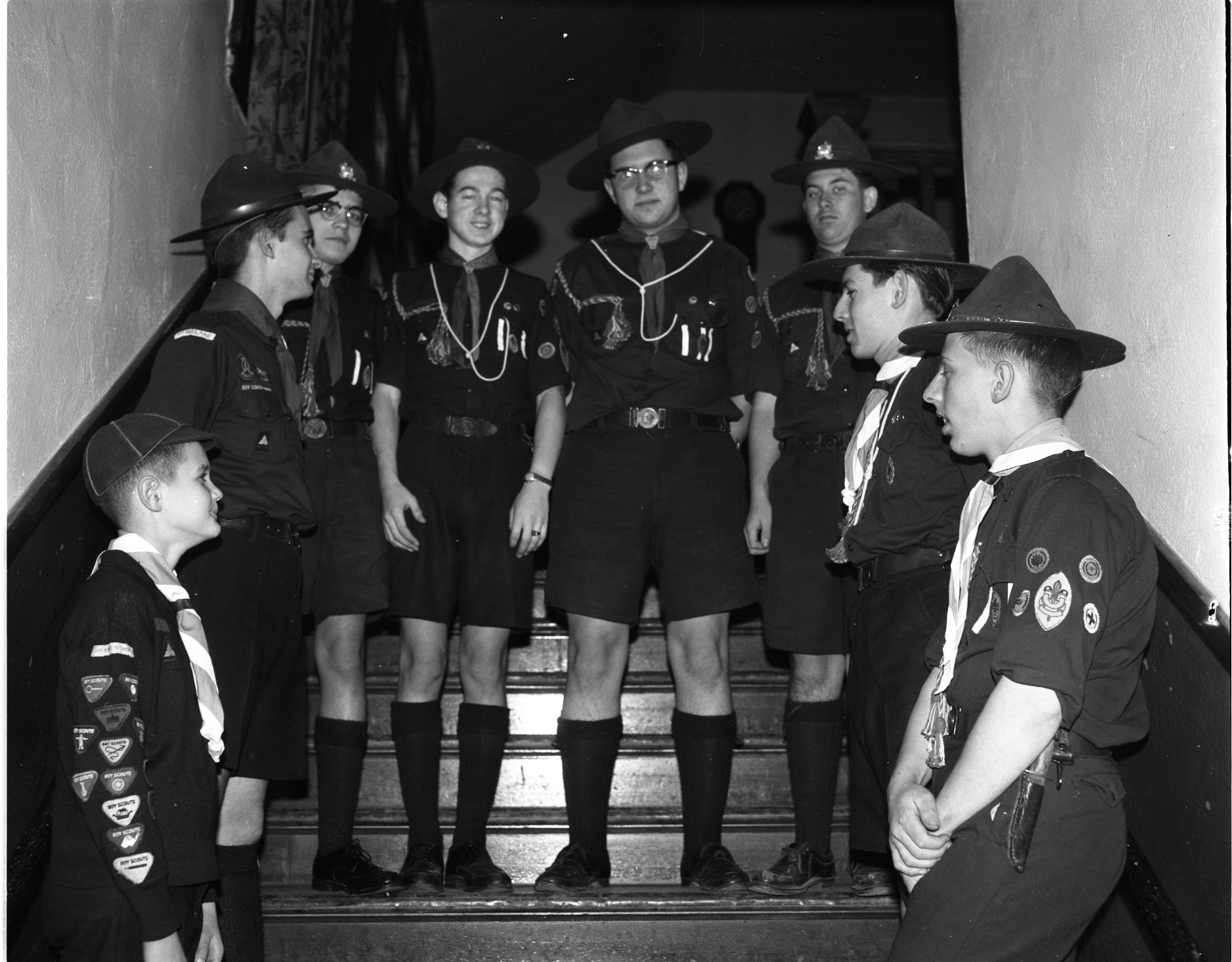 Midland has four new Queen’s Scouts in Tom Gordanier, Marvin Howard, Ken Cleary and Gregory Griesbach. They are seen in the top row along with four other lads on their way up the Scouting ladder. Other Scouts are clockwise from left, David Gosselin, sporting 13 proficiency badges; Paul Delaney, a 1st class probationer; the four Queen’s Scouts; and 1st class probationers Art Langley and Allan Bellchambers.