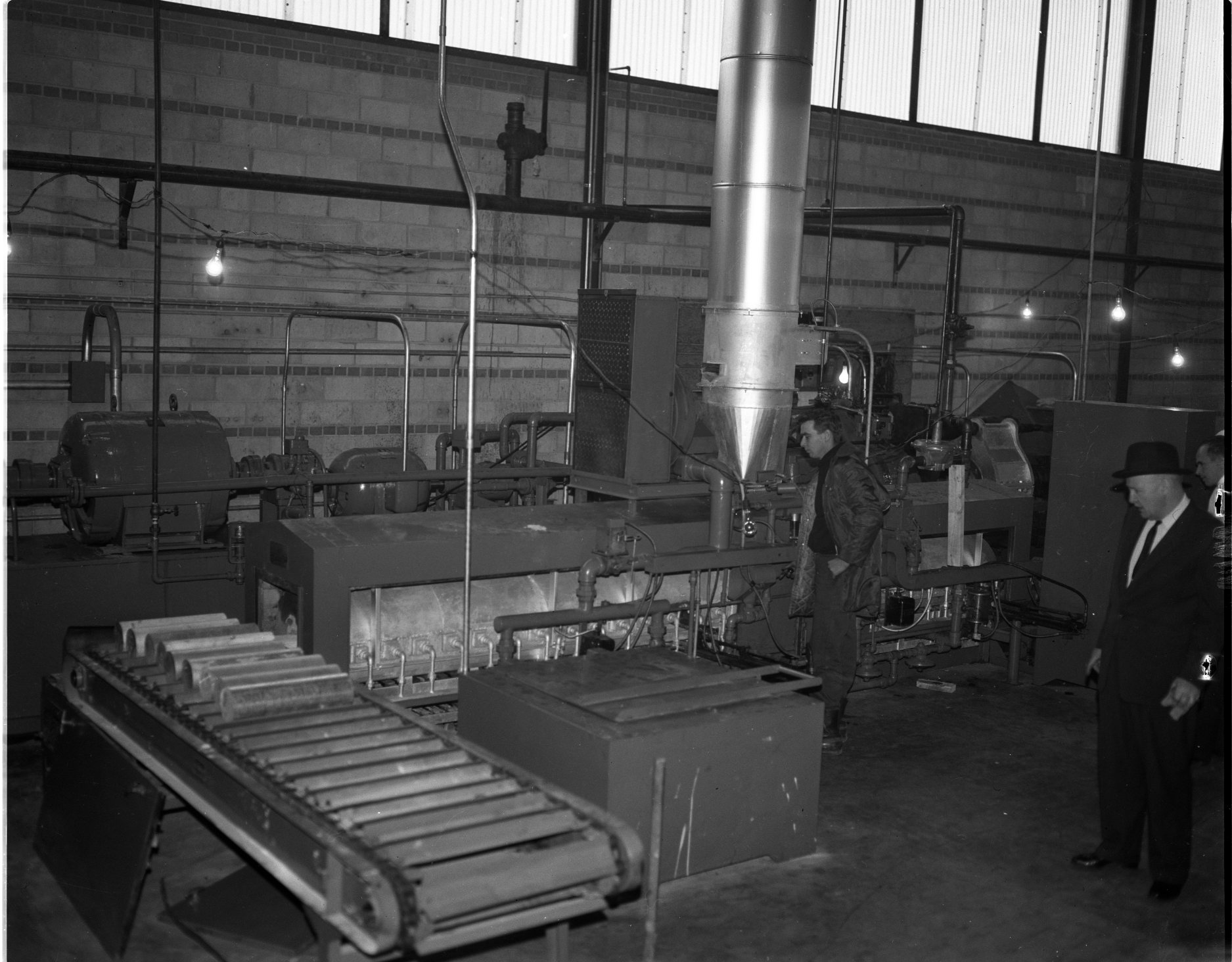 Installed recently in the new addition to the Canadian Name Plate plant in Midland, and now in operation, is this aluminum extruder. Aluminum is heated 800 degrees Fahrenheit in the oven in the previous picture. One of the 36-inch billets is seen coming out of another portion of the machine in the lower picture. The hot billet is then pushed through dies of various shapes under pressure of 900 pounds per square inch, emerging on to 115-foot long run-out tables.