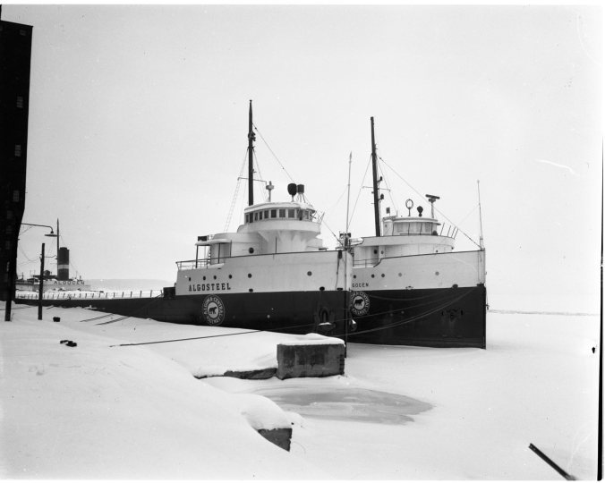 Two more members of Midland’s winter fleet are pictured above. They are the Algosteel, nearest the camera, and the Algocen, both of the Algoma Central Steamship Line. They are berthed at Aberdeen elevator, where they make frequent visits during the navigation season.