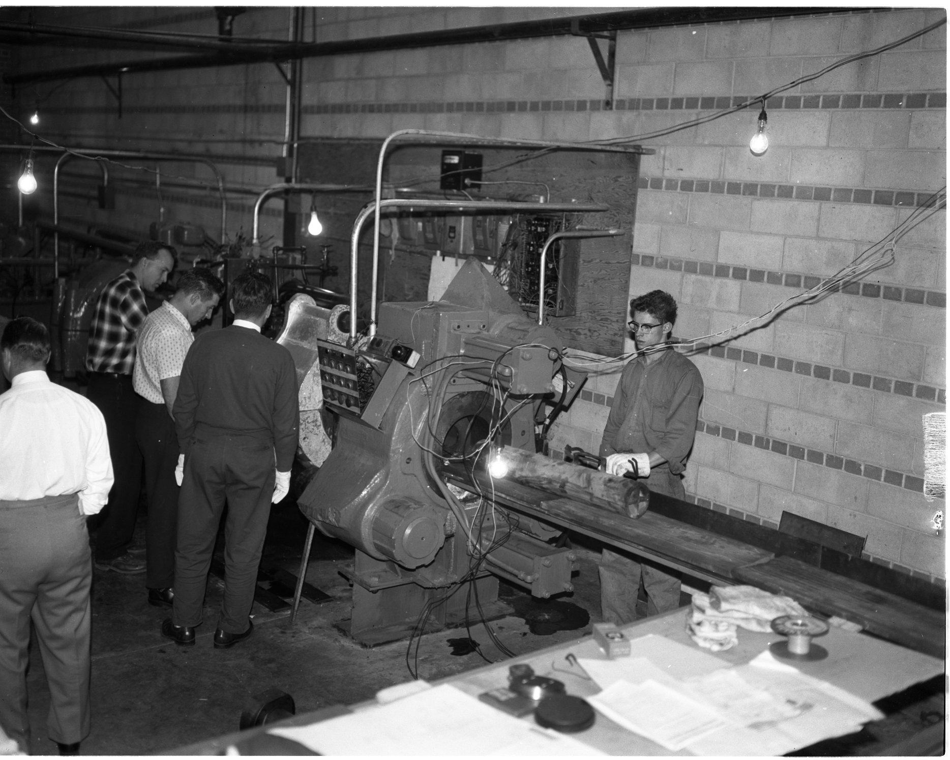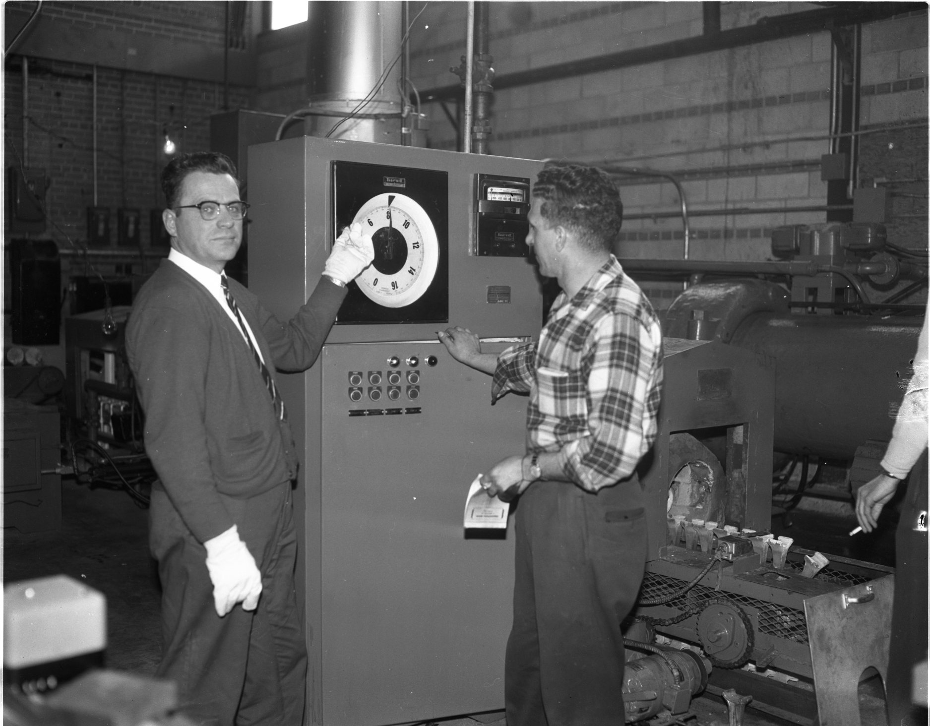 Hydro inspector Ed Brewer, left, and a plant employee, watch temperature gauge during “run in” of new aluminum machine at the Canadian Name Plate factory in Midland Friday. Gauge shows a temperature of 800 degrees Fahrenheit being applied to the aluminum billets used in the new extruder.