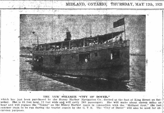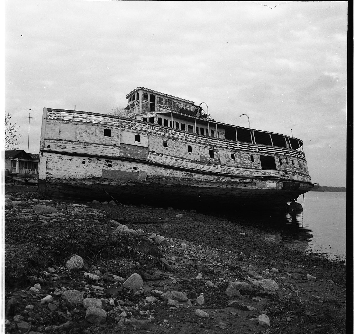 The old Georgian Bay steamer City of Dover was beached high and dry when the level of Gloucester Pool was dropped six feet last week to enable repairs to the dam at Port Severn. The Dover’s owners, Mr. and Mrs. Byron Sheffield, hope to make a more permanent berth for the vessel when the water rises again. Their plan is to use her as a novel recreation centre for their resort. October 1965.