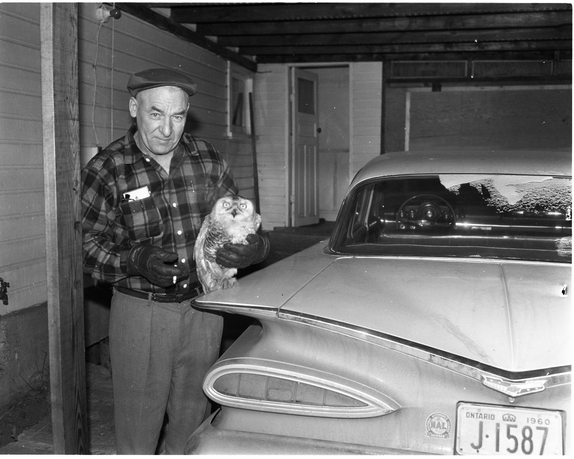 No, it’s not stuffed, says Joe Huston Sr. of the big Arctic owl he’s holding at his home, 34 Victoria Street, Midland. Joe found “Jim”, the owl, at the bottom (inside) of the big smoke stack at CSL elevator some three months ago. “Jim” was in pretty bad shape, with one foot missing and a wing badly damaged. Now Jim has the run of a big shed at the back of Mr. Huston’s home, where he devours some two or three pounds of meat tossed his way daily. It doesn’t pay strangers to get in the way of his one good claw, or his equally powerful beak. Mr. Huston is thinking of turning Jim over to conservation officials later, when Jim’s bad leg heals.