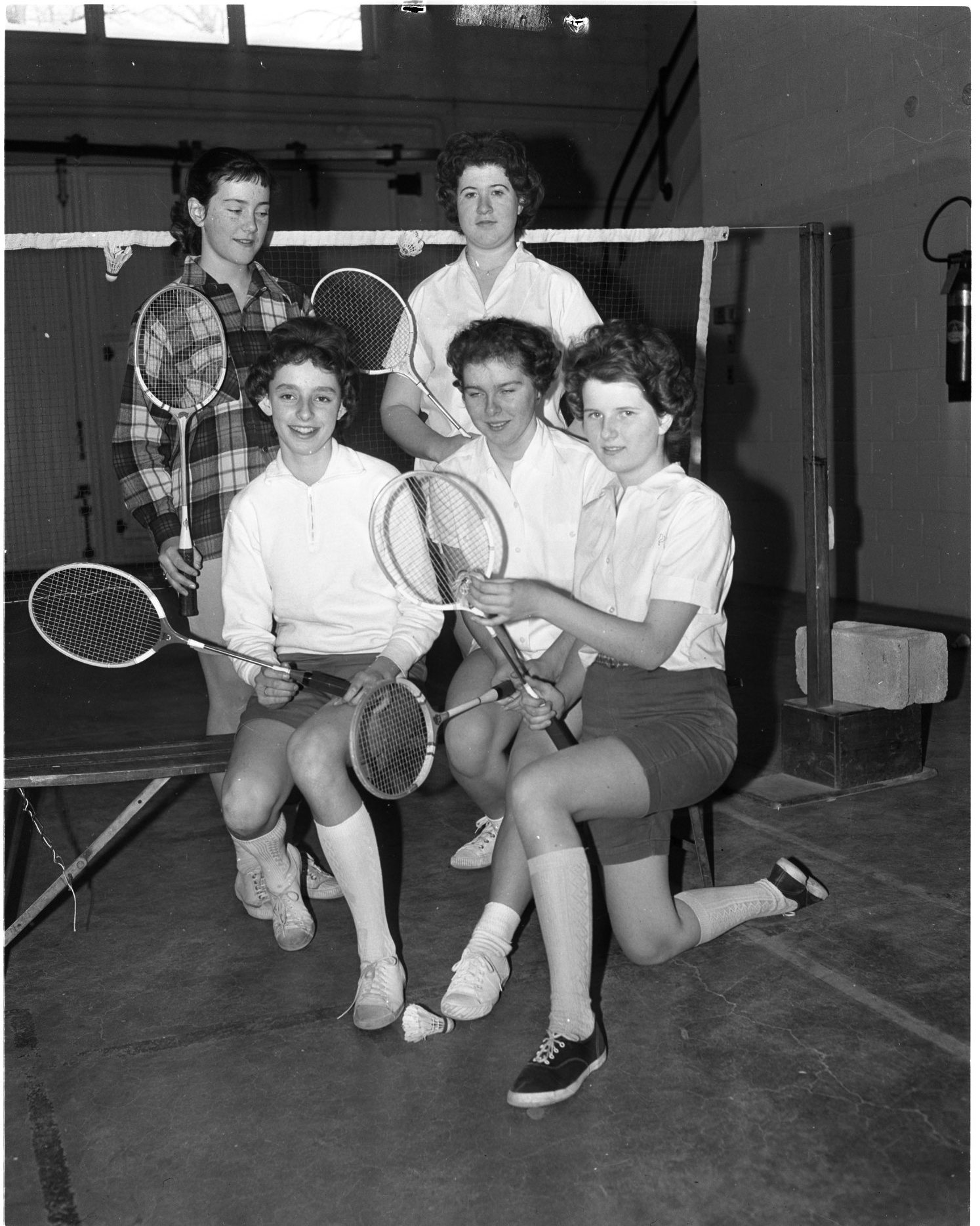 These young girls are hard at work at Midland Garrison Badminton Club these days, getting ready for the Young Ontario junior badminton championships to be held at Niagara Falls, Feb. 3-5. Seated, left to right, are Marie McLaughlin, Arlene Staruch and Margaret Ann Kearns. Standing are Margaret Taylor and Elaine Binkley.