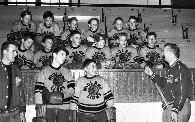 Midland Lions hockey team. Back row Dennis Abbott, Doug French, Keith Bath, Chester Graham, Ken Edgar and Bob Clayton. Middle row Mike Robitaille, John Sutton, Randy Small, David Brooks, Bob Weckman and Alan Mostyn. Front Row Joe Houston ( coach ), Wayne Holden, Art McComb and Rev Len Self. Players identified by Wayne Holden.