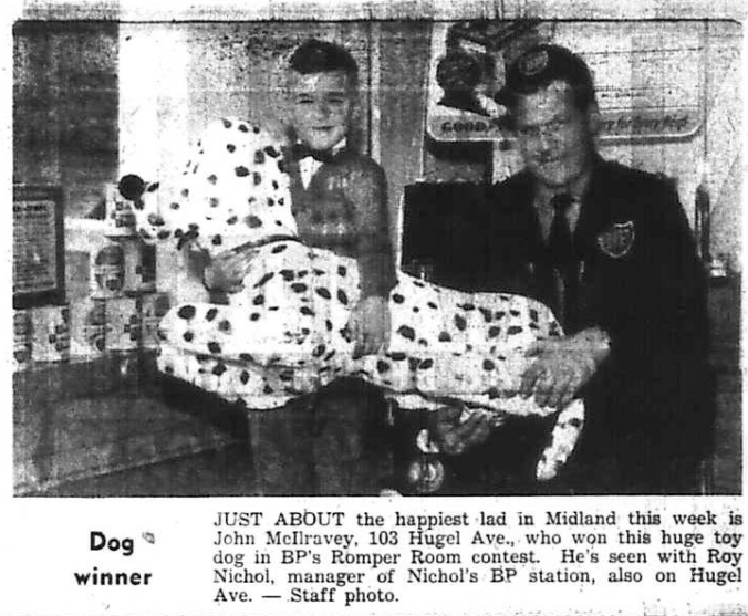 Midland council at a special meeting Monday night gave third reading and approval to a bylaw regulating the hours of retail gasoline outlets in Midland. Reeve Percy Crawford and Alderman Albert Atkinson were opposed to the bylaw. Alderman Oliver Lesperance with Mr. Crawford and Mr. Atkinson opposed the third reading of the bylaw. Alderman Wm. Thompson, Walter Woods and Deputy-reeve Grigg were in favor. Mayor Charles Parker cast the deciding vote in favor of the third reading. L. Bosley of Bosley’s Service Station objected to Taylor’s Service station being exempt from the bylaw and said there was discrimination against him (Bosley). The reeve agreed with Mr. Bosley. Reeve Crawford said he was opposed because council would be responsible if a court case arose from the decision. “I hope it doesn’t cause a lawsuit but it probably will,” added Mr. Bosley. The bylaw provides that service stations, Mondays to Fridays, will close at 7 p.m. and open at 7 a.m. the following morning and on Saturday they will close at 7 p.m. and remain closed until 7 a.m. Monday. Two duty service stations will be permitted to remain open every weekend. [Bosley’s was at the corner of Fifth and Vindin, he operated a service station, drive in restaurant and coin operated car wash.)
