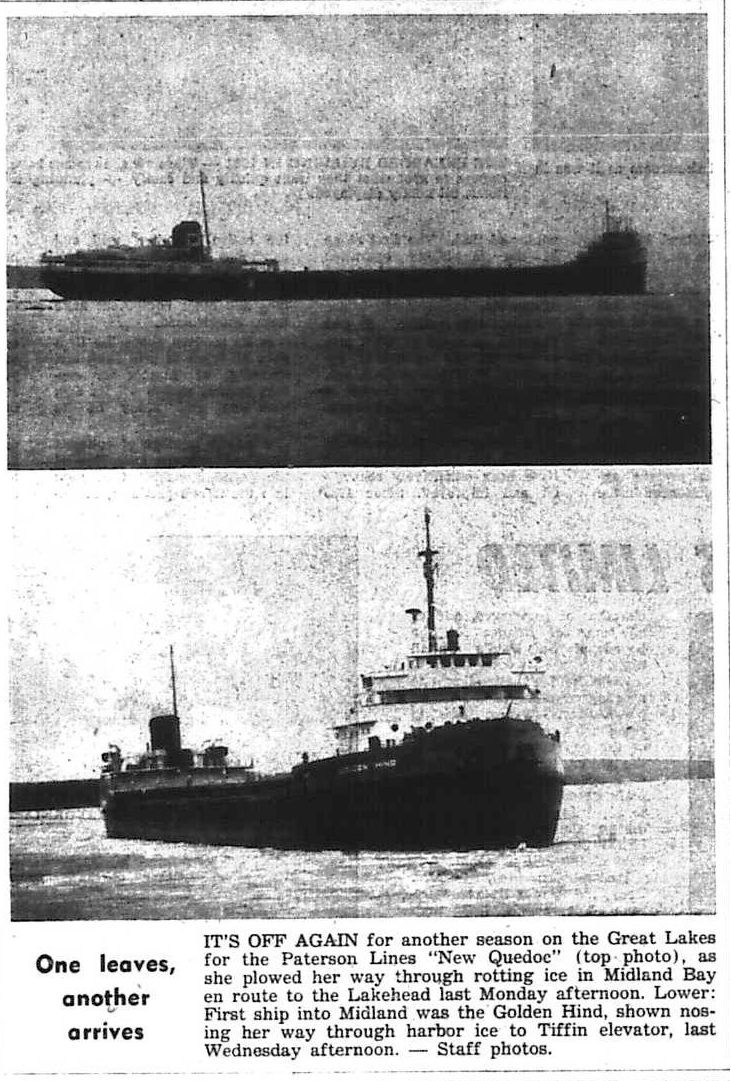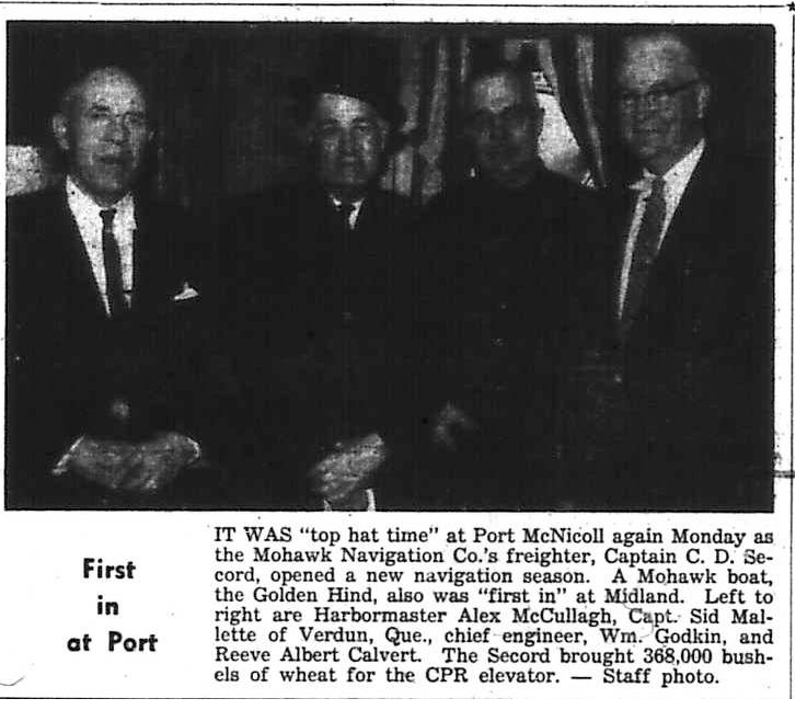 Captains and engineers of Great Lakes ships in the Midland area recently tendered a dinner to Allan Dane and Roy Wilson of the government wireless station and John Smith, government steamship inspector. The meeting heard that all three men will be leaving Midland at the end of the month when the wireless station and the steamship inspection office will be closed. Chairman of the dinner, held at the Georgian Hotel, was George Burns superintendent of Canadian Pacific Steamships at Port McNicoll. Percy Eagles of Great Lakes Boat and Machine Co. Ltd., paid tribute to Mr. Smith and expressed regret that the inspector was leaving Midland. Mayor Charles Parker said Midland was disappointed about losing the wireless station and the steamship inspection office and it was hoped they might return to Midland.